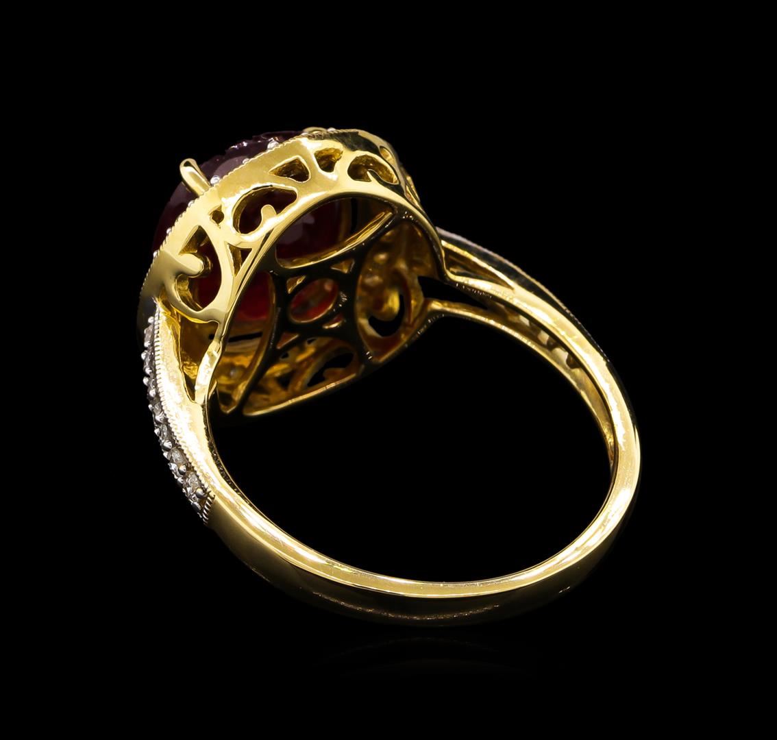 One electronically tested 14KT yellow gold ladies cast ruby and diamond ring. Condition is new, good workmanship. The featured ruby is set within a diamond bezel supported by diamond set shoulders, completed by a two millimeter wide band. Bright polish finish with rhodium accents and milgrain detailing. Trademark is Orianne. Identified with markings of "14K". Containing: One prong set oval mixed cut natural ruby, measuring 10.10 x 9.00 x 6.20mm, 10%. bulge factor, approximate weight of 4.98ct., clarity is heavily included, type II, medium dark, very slightly brownish, slightly purplish red color, (GIA slpR 6/3), cut is good. Transmitting light somewhat diffusely, transparent to translucent. Naturally occurring internal & external characteristics are present. Indications of laboratory high temperature heat treatment, with glass & flux additives. Graded in the setting. Ruby has a low tolerance to rhodium plating, repolishing the surface, & ultrasonic cleaning. Forty-Two prong set round brilliant cut diamonds, measuring 1.50 - 1.40 x 0.87mm (depth est.) approximate. Total Weight of 42 Stones = 0.56ct. Graded in the setting. Clarity: SI-1 to I-1 . Color: G - I. Total Weight of Colored Stones 4.98ct.. Total Weight of Diamonds 0.56ct.. Total Weight of Ring 4.92gm. AIG Appraised at $3,870.00.