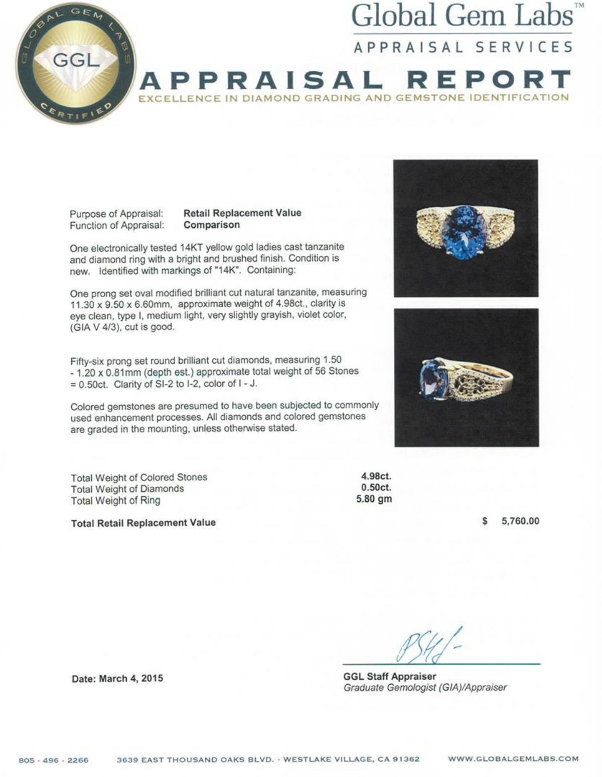One electronically tested 14KT yellow gold ladies cast tanzanite and diamond ring with a bright and brushed finish. Identified with markings of "14K". Condition is new. Containing: One prong set oval modified brilliant cut natural tanzanite, measuring 11.30 x 9.50 x 6.60mm, approximate weight of 4.98ct., clarity is eye clean, type I, medium light, very slightly grayish, violet color, (GIA V 4/3), cut is good. Fifty-Six prong set round brilliant cut diamonds, measuring 1.50 - 1.20 x 0.81mm (depth est.) approximate total weight of 56 Stones = 0.50ct. Clarity: SI-2 to I-2. Color: I - J. Colored gemstones are presumed to have been subjected to commonly used enhancement processes. All diamonds and colored gemstones are graded in the mounting, unless otherwise stated. Total Weight of Colored Stones 4.98ct. Total Weight of Diamonds 0.50ct. Total Weight of Ring 5.80 grams. GGL Appraised.