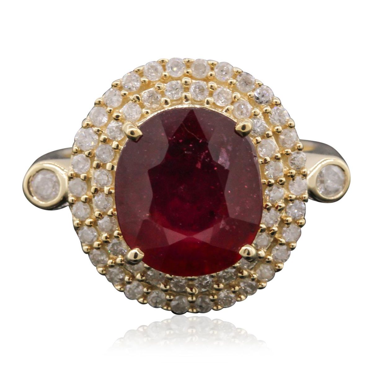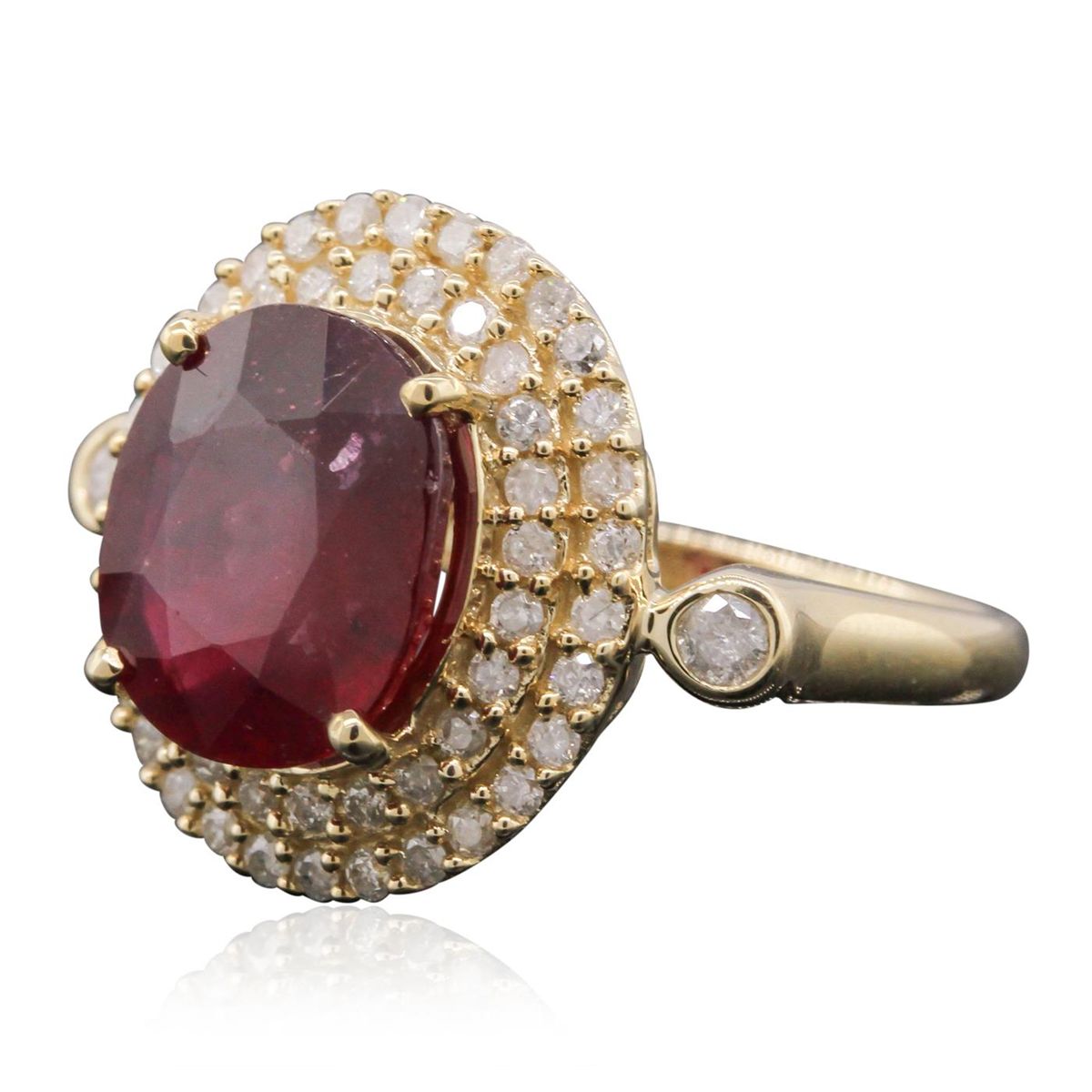 One electronically tested 14KT yellow gold ladies cast ruby and diamond ring with a bright polish finish. The featured ruby is set within a diamond bezel, supported by diamond accented shoulders, and completed by a two millimeter wide band. Trademark is Orianne. Identified with markings of "14K". Condition is new, good workmanship. Containing: One prong set oval mixed cut natural ruby, measuring 11.00. x 9.50 x 4.80mm, 8%. bulge factor, approximate weight of 4.98ct., clarity is eye clean, type II, medium dark, moderately strong, slightly purplish red color, (GIA slpR 6/4), cut is good. Transmitting light somewhat diffusely, transparent to translucent. Naturally occurring internal & external characteristics are present. Indications of laboratory high temperature heat treatment, with glass & flux additives. Graded in the setting. Ruby has a low tolerance to rhodium plating, repolishing the surface, & ultrasonic cleaning.Fifty-Six prong set round brilliant cut diamonds, measuring 2.20 - 1.30 x 1.05mm (depth est.) approximate. Total Weight of 56 Stones = 0.60ct. Graded in the setting. Clarity: I-2 to I-3 . Color: G - I. Total Weight of Colored Stones 4.98ct. Total Weight of Diamonds 0.60ct. Total Weight of Ring 6.30gm. AIG Appraised at $3,645.00.