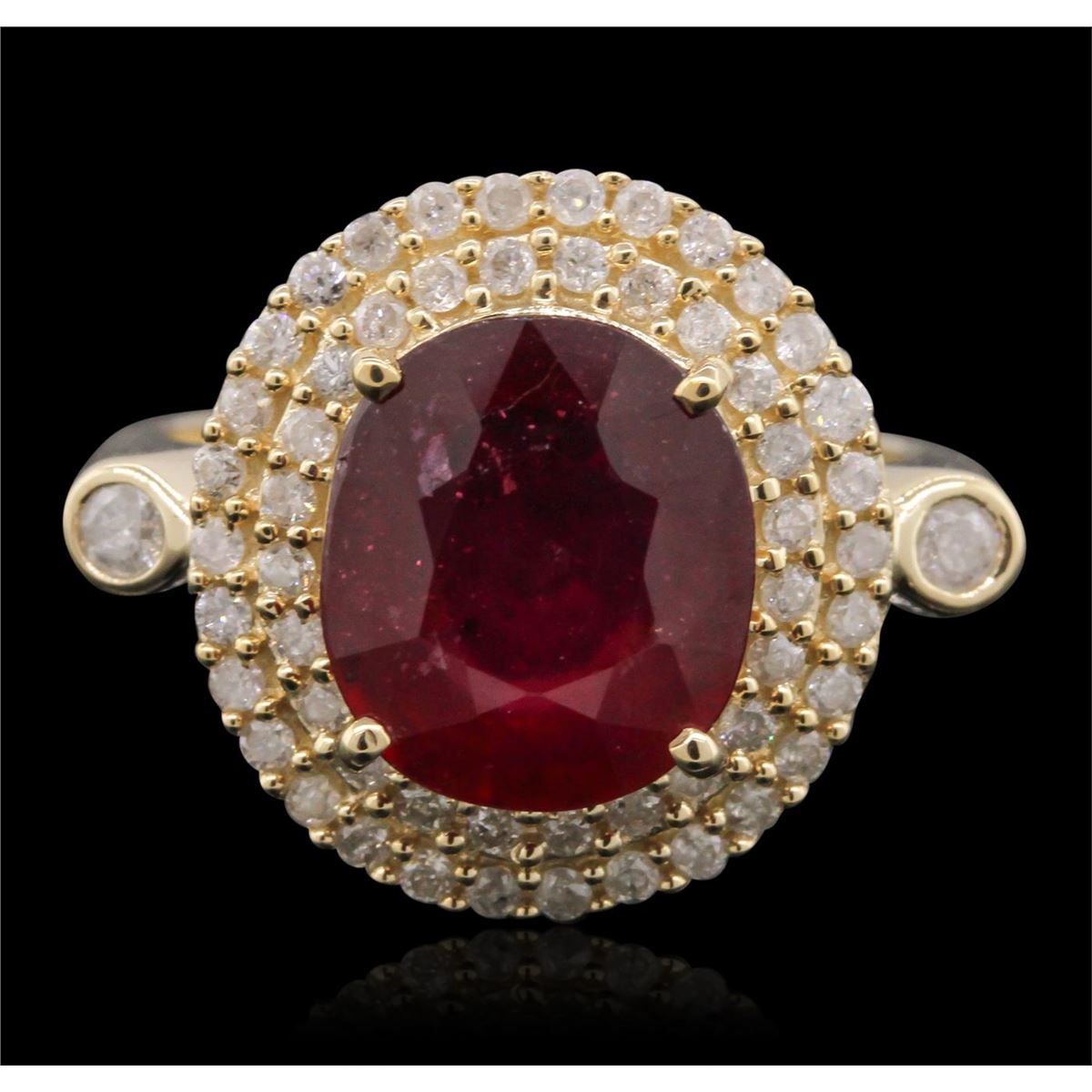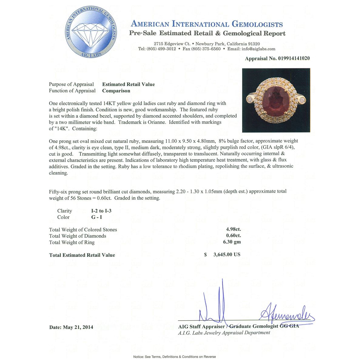 One electronically tested 14KT yellow gold ladies cast ruby and diamond ring with a bright polish finish. The featured ruby is set within a diamond bezel, supported by diamond accented shoulders, and completed by a two millimeter wide band. Trademark is Orianne. Identified with markings of "14K". Condition is new, good workmanship. Containing: One prong set oval mixed cut natural ruby, measuring 11.00. x 9.50 x 4.80mm, 8%. bulge factor, approximate weight of 4.98ct., clarity is eye clean, type II, medium dark, moderately strong, slightly purplish red color, (GIA slpR 6/4), cut is good. Transmitting light somewhat diffusely, transparent to translucent. Naturally occurring internal & external characteristics are present. Indications of laboratory high temperature heat treatment, with glass & flux additives. Graded in the setting. Ruby has a low tolerance to rhodium plating, repolishing the surface, & ultrasonic cleaning.Fifty-Six prong set round brilliant cut diamonds, measuring 2.20 - 1.30 x 1.05mm (depth est.) approximate. Total Weight of 56 Stones = 0.60ct. Graded in the setting. Clarity: I-2 to I-3 . Color: G - I. Total Weight of Colored Stones 4.98ct. Total Weight of Diamonds 0.60ct. Total Weight of Ring 6.30gm. AIG Appraised at $3,645.00.
