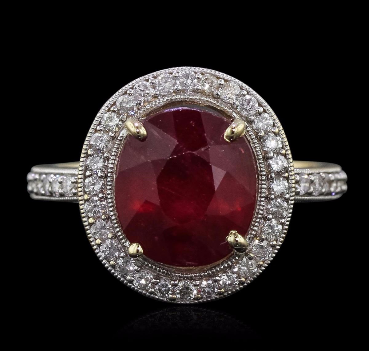 One electronically tested 14KT yellow gold ladies cast ruby and diamond ring. Condition is new, good workmanship. The featured ruby is set within a diamond bezel supported by diamond set shoulders, completed by a two millimeter wide band. Bright polish finish with rhodium accents and milgrain detailing. Trademark is Orianne. Identified with markings of "14K". Containing: One prong set oval mixed cut natural ruby, measuring 10.10 x 9.00 x 6.20mm, 10%. bulge factor, approximate weight of 4.98ct., clarity is heavily included, type II, medium dark, very slightly brownish, slightly purplish red color, (GIA slpR 6/3), cut is good. Transmitting light somewhat diffusely, transparent to translucent. Naturally occurring internal & external characteristics are present. Indications of laboratory high temperature heat treatment, with glass & flux additives. Graded in the setting. Ruby has a low tolerance to rhodium plating, repolishing the surface, & ultrasonic cleaning. Forty-Two prong set round brilliant cut diamonds, measuring 1.50 - 1.40 x 0.87mm (depth est.) approximate. Total Weight of 42 Stones = 0.56ct. Graded in the setting. Clarity: SI-1 to I-1 . Color: G - I. Total Weight of Colored Stones 4.98ct.. Total Weight of Diamonds 0.56ct.. Total Weight of Ring 4.92gm. AIG Appraised at $3,870.00.