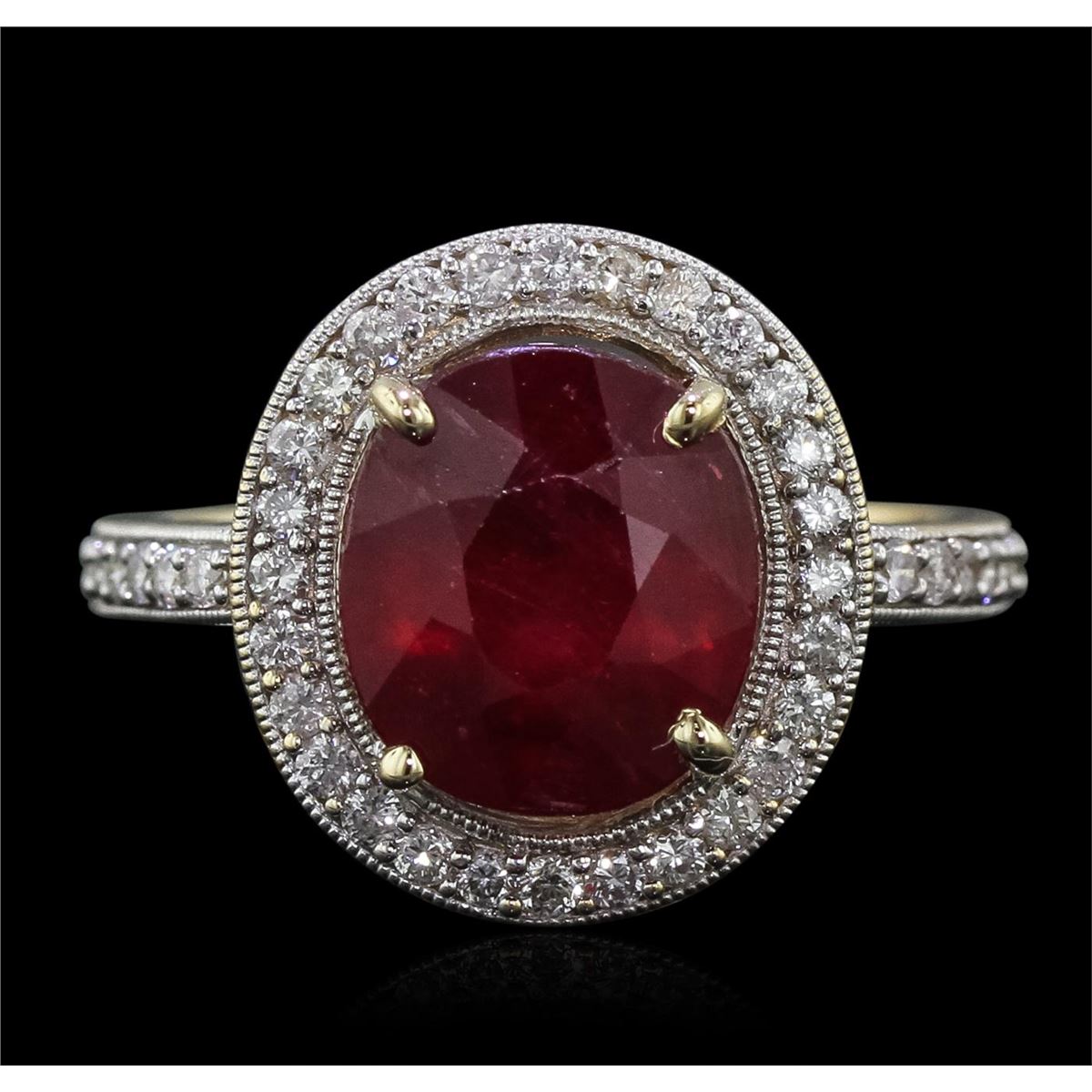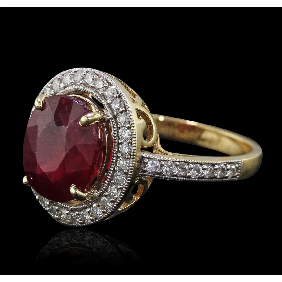 One electronically tested 14KT yellow gold ladies cast ruby and diamond ring. Condition is new, good workmanship. The featured ruby is set within a diamond bezel supported by diamond set shoulders, completed by a two millimeter wide band. Bright polish finish with rhodium accents and milgrain detailing. Trademark is Orianne. Identified with markings of "14K". Containing: One prong set oval mixed cut natural ruby, measuring 10.10 x 9.00 x 6.20mm, 10%. bulge factor, approximate weight of 4.98ct., clarity is heavily included, type II, medium dark, very slightly brownish, slightly purplish red color, (GIA slpR 6/3), cut is good. Transmitting light somewhat diffusely, transparent to translucent. Naturally occurring internal & external characteristics are present. Indications of laboratory high temperature heat treatment, with glass & flux additives. Graded in the setting. Ruby has a low tolerance to rhodium plating, repolishing the surface, & ultrasonic cleaning. Forty-Two prong set round brilliant cut diamonds, measuring 1.50 - 1.40 x 0.87mm (depth est.) approximate. Total Weight of 42 Stones = 0.56ct. Graded in the setting. Clarity: SI-1 to I-1 . Color: G - I. Total Weight of Colored Stones 4.98ct.. Total Weight of Diamonds 0.56ct.. Total Weight of Ring 4.92gm. AIG Appraised at $3,870.00.