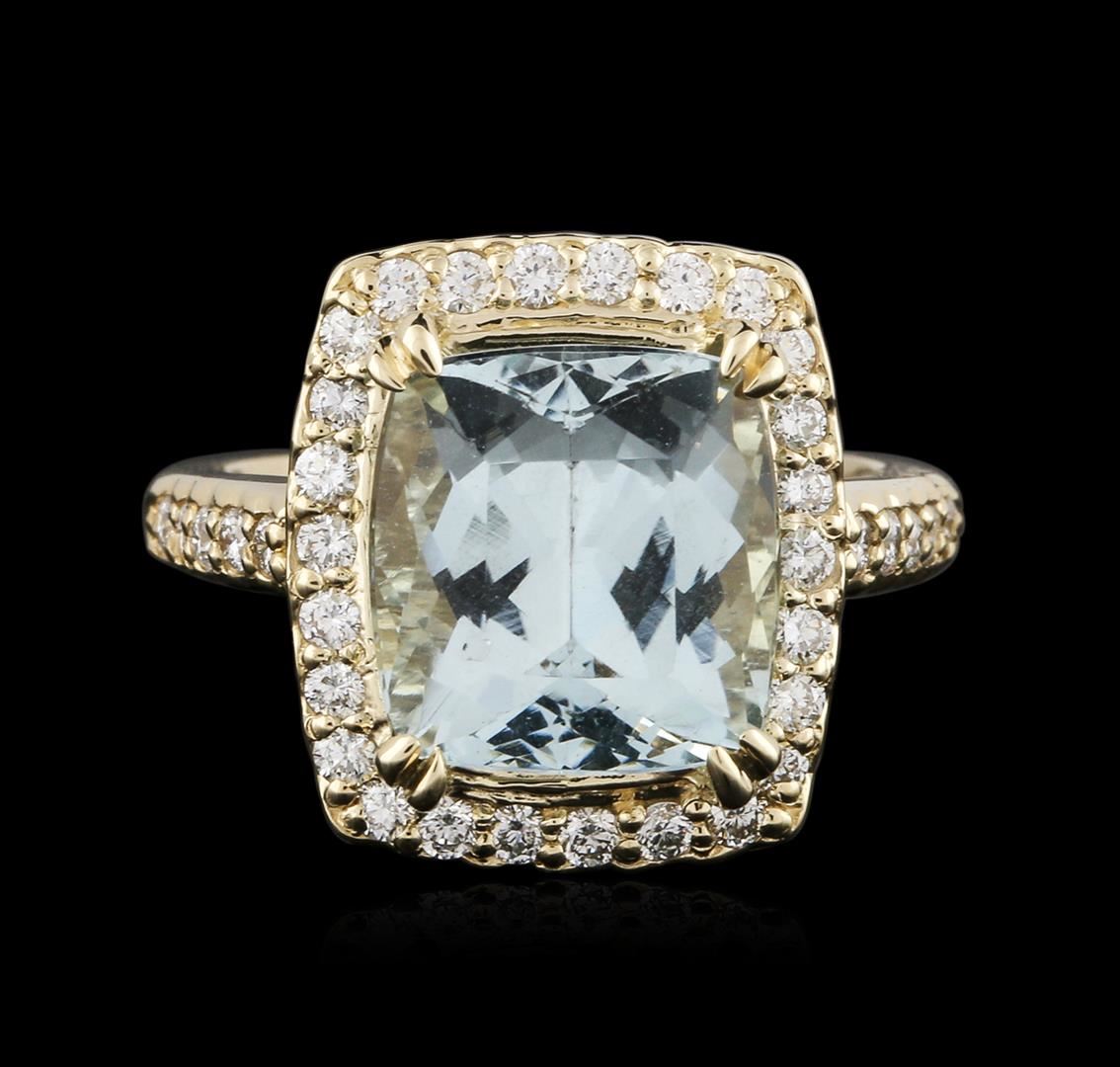 One electronically tested 14KT yellow gold ladies cast aquamarine and diamond ring with a bright polish finish. Identified with markings of "K14". Condition is new. Containing: One prong set rectangular cushion modified brilliant cut natural aquamarine, measuring 12.00. x 10.00. x 6.50mm, approximate weight of 4.99ct., clarity is eye clean, type III, light, slightly grayish, blue color, (GIA vstbG 3/2), cut is good. Thirty-Six prong set round brilliant cut diamonds, measuring 1.50 - 1.50 x 0.90mm (depth est.) approximate total weight of 36 Stones = 0.44ct. Clarity: SI-1 to SI-2. Color: I - J, Cut is Good. Colored gemstones are presumed to have been subjected to commonly used enhancement processes. All diamonds and colored gemstones are graded in the mounting, unless otherwise stated. Total Weight of Colored Stones 4.99ct. Total Weight of Diamonds 0.44ct. Total Weight of Ring 8.10 grams. GGL Appraised at $3,840.00.