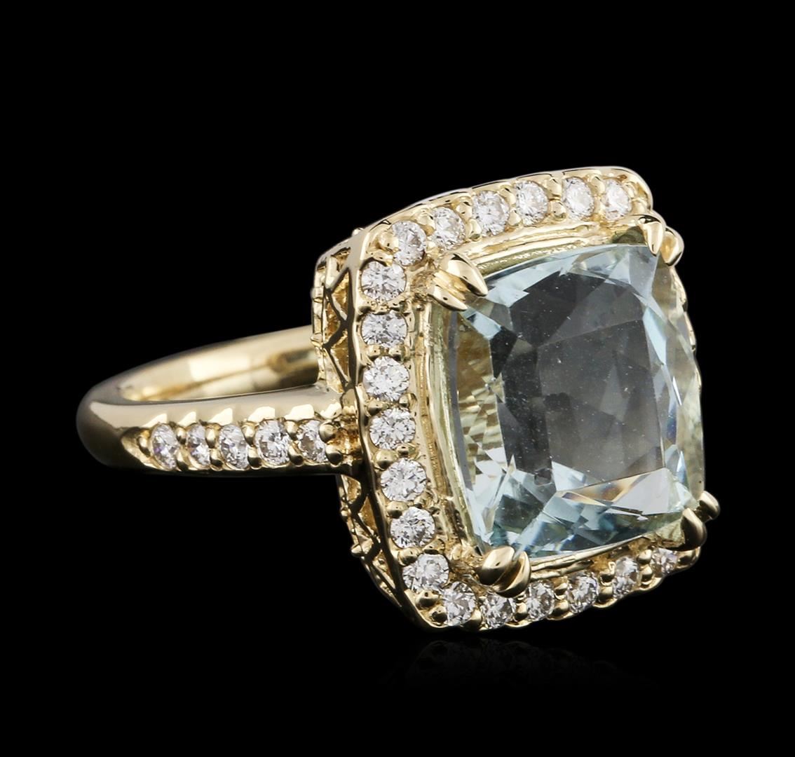 One electronically tested 14KT yellow gold ladies cast aquamarine and diamond ring with a bright polish finish. Identified with markings of "K14". Condition is new. Containing: One prong set rectangular cushion modified brilliant cut natural aquamarine, measuring 12.00. x 10.00. x 6.50mm, approximate weight of 4.99ct., clarity is eye clean, type III, light, slightly grayish, blue color, (GIA vstbG 3/2), cut is good. Thirty-Six prong set round brilliant cut diamonds, measuring 1.50 - 1.50 x 0.90mm (depth est.) approximate total weight of 36 Stones = 0.44ct. Clarity: SI-1 to SI-2. Color: I - J, Cut is Good. Colored gemstones are presumed to have been subjected to commonly used enhancement processes. All diamonds and colored gemstones are graded in the mounting, unless otherwise stated. Total Weight of Colored Stones 4.99ct. Total Weight of Diamonds 0.44ct. Total Weight of Ring 8.10 grams. GGL Appraised at $3,840.00.