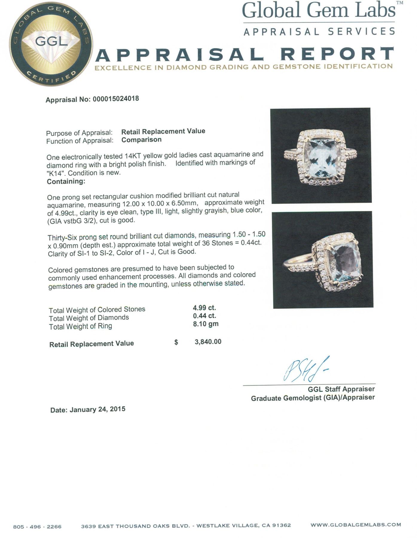 One electronically tested 14KT yellow gold ladies cast aquamarine and diamond ring with a bright polish finish. Identified with markings of "K14". Condition is new. Containing: One prong set rectangular cushion modified brilliant cut natural aquamarine, measuring 12.00. x 10.00. x 6.50mm, approximate weight of 4.99ct., clarity is eye clean, type III, light, slightly grayish, blue color, (GIA vstbG 3/2), cut is good. Thirty-Six prong set round brilliant cut diamonds, measuring 1.50 - 1.50 x 0.90mm (depth est.) approximate total weight of 36 Stones = 0.44ct. Clarity: SI-1 to SI-2. Color: I - J, Cut is Good. Colored gemstones are presumed to have been subjected to commonly used enhancement processes. All diamonds and colored gemstones are graded in the mounting, unless otherwise stated. Total Weight of Colored Stones 4.99ct. Total Weight of Diamonds 0.44ct. Total Weight of Ring 8.10 grams. GGL Appraised at $3,840.00.