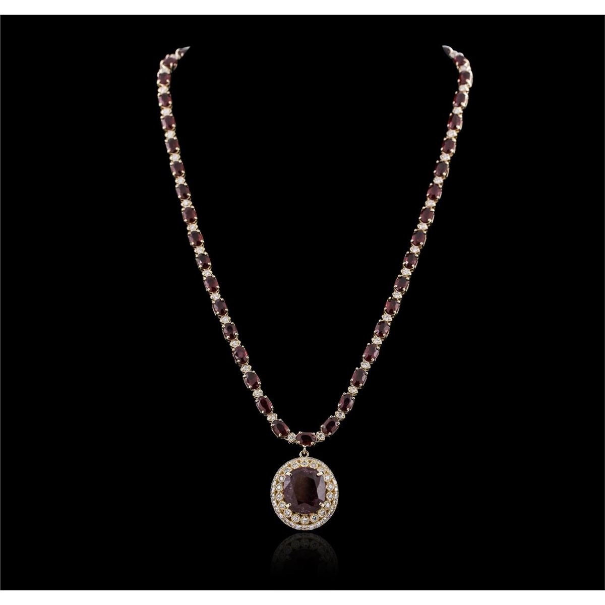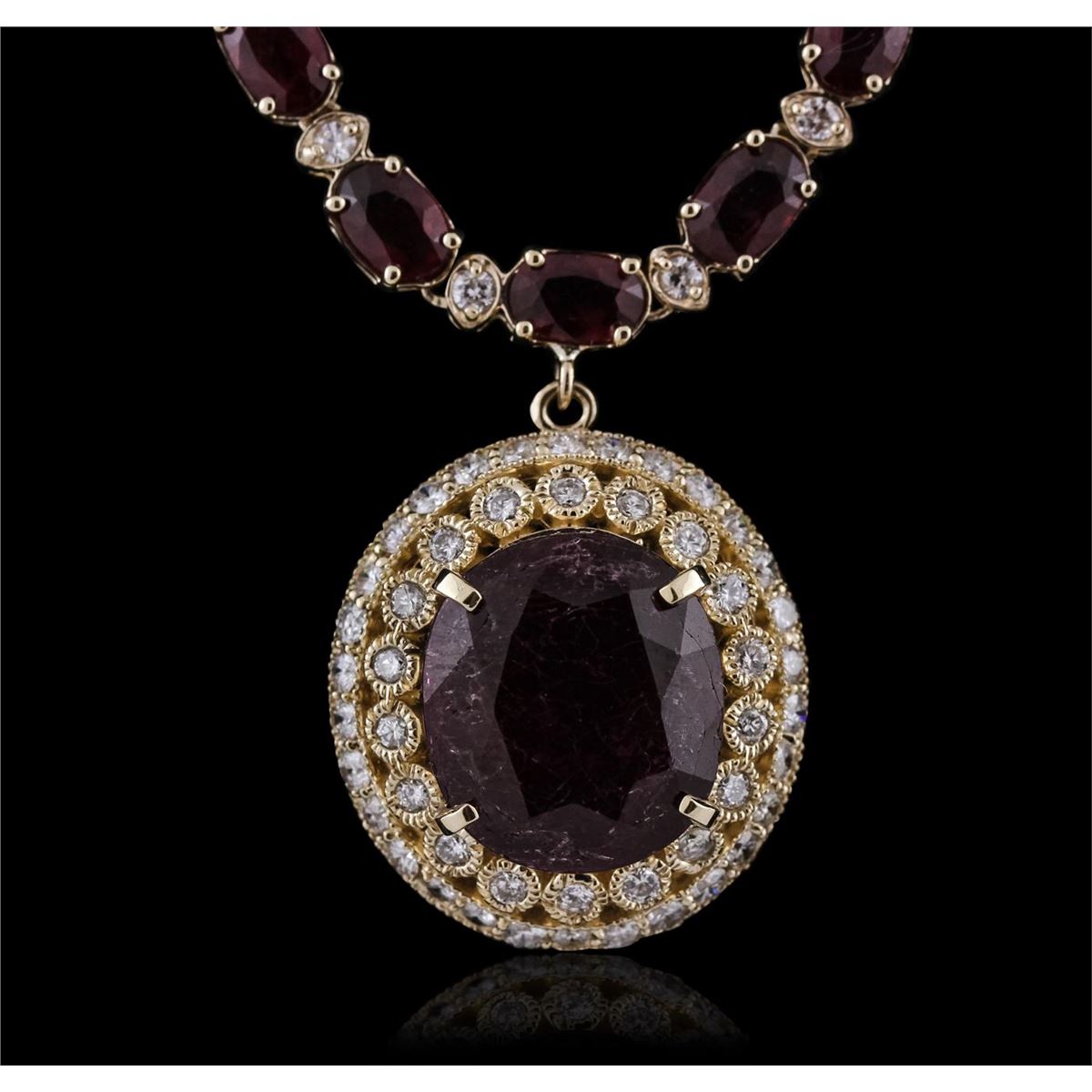 One electronically tested 14KT yellow gold ladies cast & assembled ruby and diamond necklace. Seventeen and one-half inch length necklace features a ruby and diamond pendant supported by a flexible ruby and diamond ribbon, terminating in a concealed clasp with safety. Bright polish finish with milgrain detailing. Identified with markings of "14K". Condition is new, good workmanship. Containing: One prong set oval mixed cut natural ruby, measuring 15.00. x 13.50 x 7.25mm, 8%. bulge factor, approximate weight of 12.72ct., clarity is heavily included, type II, dark, very slightly brownish, slightly purplish red color, (GIA slpR 7/3), cut is good. Transmitting light somewhat diffusely, transparent to translucent. Naturally occurring internal & external characteristics are present. Indications of laboratory high temperature heat treatment, with glass & flux additives. Graded in the setting. Forty-six prong set oval mixed cut natural rubies, measuring 6.00. x 4.00. x 2.90mm, 6%. bulge factor, approximate total weight of 28.06ct., clarity is heavily included, type II, medium dark, very slightly brownish, slightly purplish red color, (GIA slpR 6/3), cut is good. Transmitting light somewhat diffusely, transparent to translucent. Naturally occurring internal & external characteristics are present. Indications of laboratory high temperature heat treatment, with glass & flux additives. Measurements & the color grade are an average for the group. Graded in the setting. Ruby has a low tolerance to rhodium plating, repolishing the surface, & ultrasonic cleaning. Ninety-Four bezel and prong set round brilliant cut diamonds, measuring 2.10 - 2.00. x 1.23mm (depth est.) approximate total weight of 94 Stones = 3.06ct. Graded in the setting. Clarity: SI-1 to I-1 . Color: G - I. Total Weight of Colored Stones 40.78ct. Total Weight of Diamonds 3.06ct. Total Weight of Necklace 32.32 grams. AIG Appraised at $19,490.00.