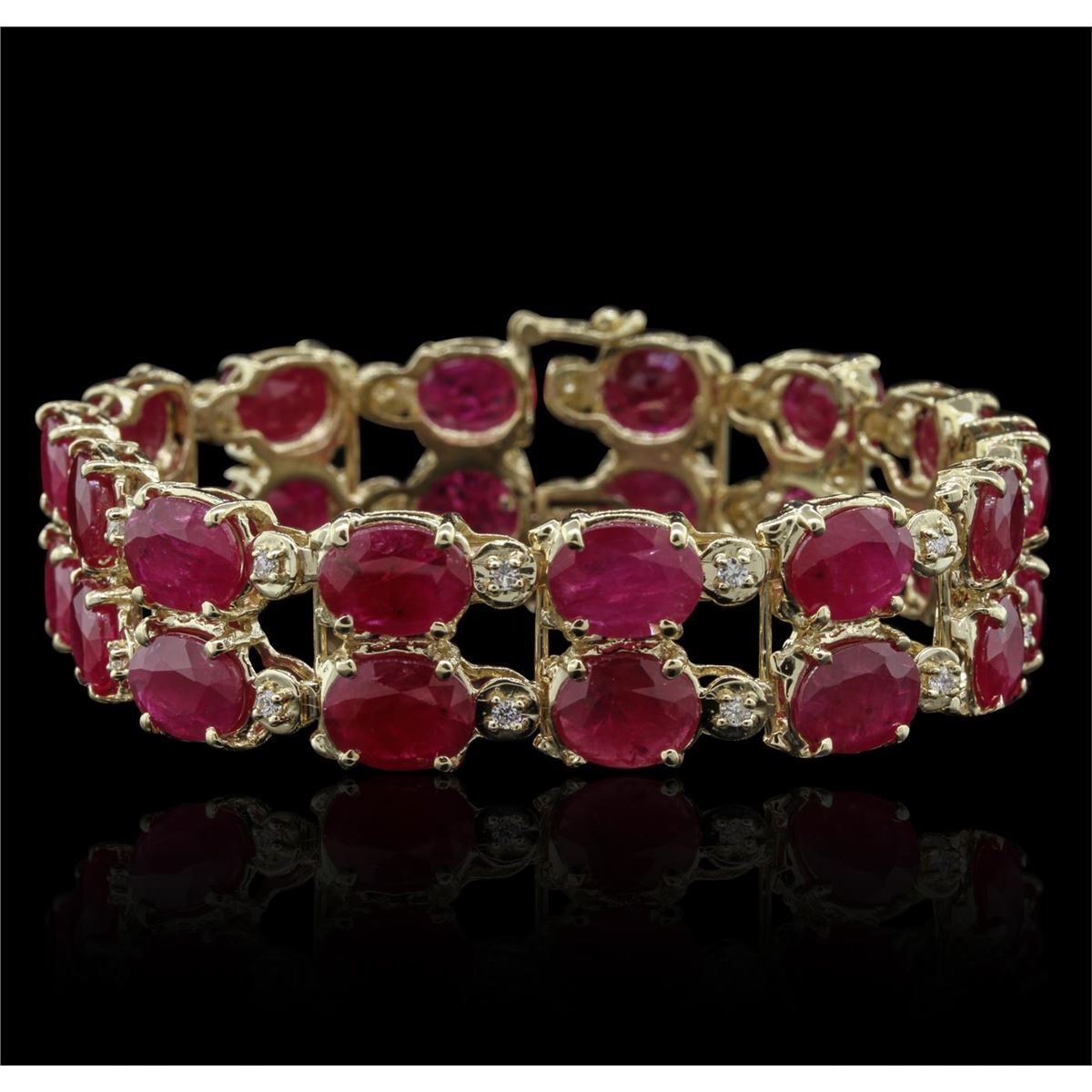 One electronically tested 14KT yellow gold Ladies combination cast & assembled bracelet with a hidden box clasp with a bright polish finish. Measurements: 7.25" in length. Identified with markings of "14K". Condition is new. Containing: Twenty-eight prong set oval modified brilliant cut natural rubies, measuring 9.00 x 6.50 x 3.11mm, approximate total weight of 41.72ct., clarity is heavily included, type II, medium dark, moderately strong, strongly purplish red color, (GIA stpR 6/4), cut is good. Indications of heat treatment with glass and flux residue. Colored gemstones are presumed to have been subjected to commonly used and possible undetectable color/clarity enhancement processes. Twenty-Eight prong set round brilliant cut diamonds, measuring 2.10 - 2.10 x 1.26mm (depth est.) approximate total weight of 28 Stones = 0.95ct. Clarity of SI-1, Color of I - J, Cut is Good. Total Weight of Colored Stones 41.72ct. Total Weight of Diamonds 0.95ct. Total Weight of Bracelet 38.10gm. GGL Appraised at $27,165.00.