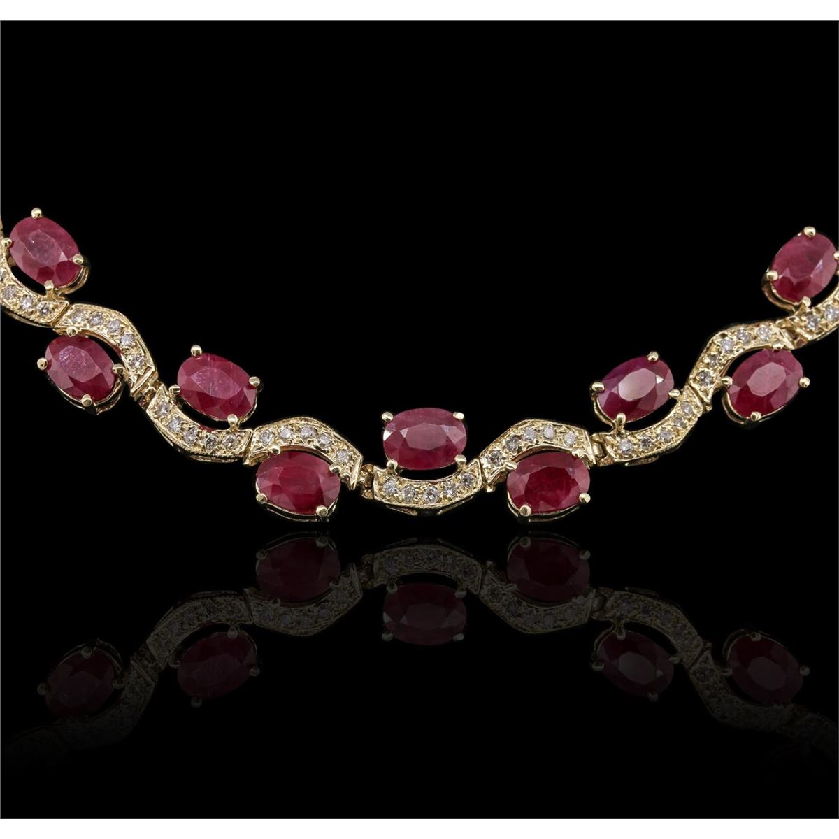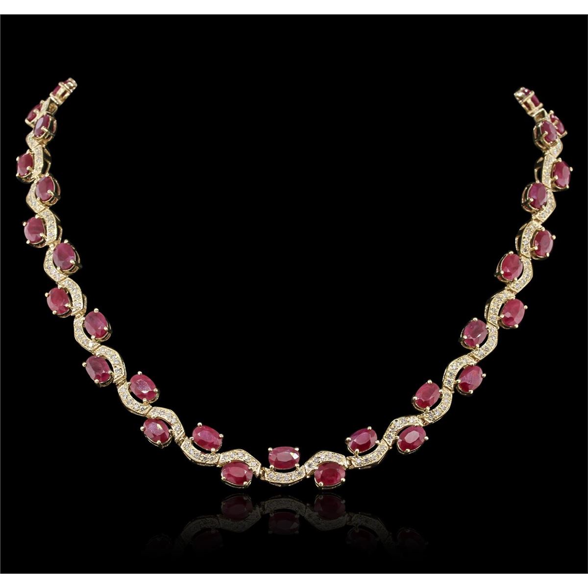 One electronically tested 14KT yellow gold Ladies combination cast & assembled necklace with a hidden box clasp with a bright polish finish. Condition is new. Measurements: 17" in length. Identified with markings of "14K". Containing: Forty-three prong set oval modified brilliant cut natural rubies, measuring 7.10 x 5.10 x 3.47mm, approximate. Total Weight of 44.29ct., clarity is heavily included, type II, medium dark, moderately strong, strongly purplish red color, (GIA stpR 6/4), cut is good. Colored gemstones are presumed to have been subjected to commonly used color/clarity enhancement processes. Two Hundred Fifteen prong set round brilliant cut diamonds, measuring 1.50 - 1.50 x 0.90mm (depth est.) approximate. Total Weight of 215 Stones = 2.65ct. Clarity: SI-1 to I-1. Color: J - K, Cut is Good. Total Weight of Colored Stones 44.29ct. Total Weight of Diamonds 2.65ct. Total Weight of Necklace 47.90 grams. GGL Appraised at $35,830.00.
