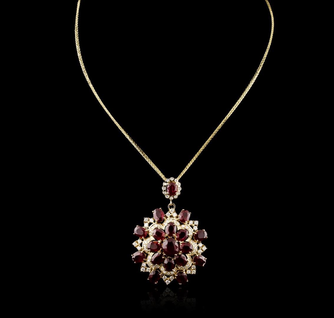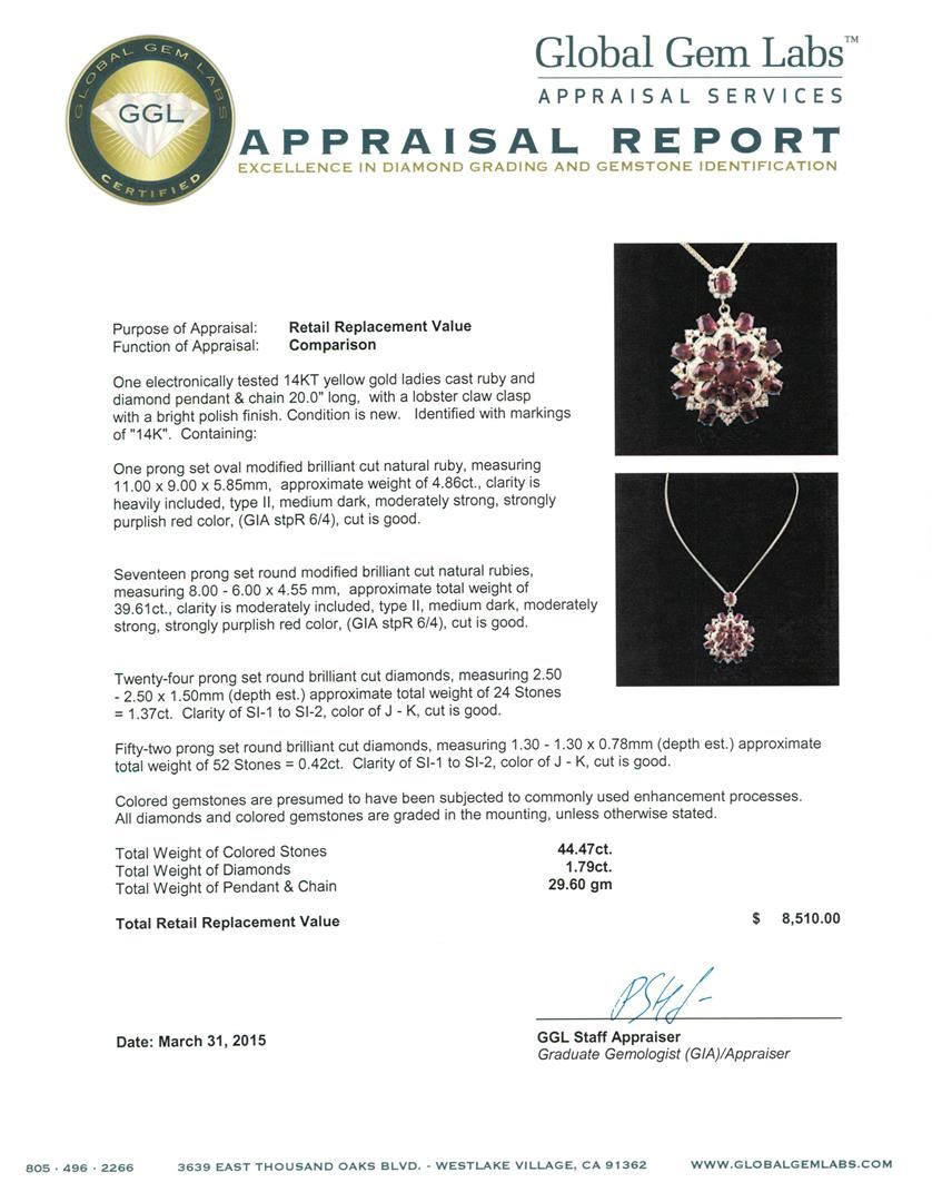 One electronically tested 14KT yellow gold ladies cast ruby and diamond pendant & chain 20.0" long, with a lobster claw clasp with a bright polish finish. Identified with markings of "14K". Condition is new. Containing: One prong set oval modified brilliant cut natural ruby, measuring 11.00. x 9.00. x 5.85mm, approximate weight of 4.86ct., clarity is heavily included, type II, medium dark, moderately strong, strongly purplish red color, (GIA stpR 6/4), cut is good. Seventeen prong set round modified brilliant cut natural rubies, measuring 8.00. - 6.00. x 4.55 mm, approximate total weight of 39.61ct., clarity is moderately included, type II, medium dark, moderately strong, strongly purplish red color, (GIA stpR 6/4), cut is good. Twenty-Four prong set round brilliant cut diamonds, measuring 2.50 - 2.50 x 1.50mm (depth est.) approximate total weight of 24 Stones = 1.37ct. Clarity: SI-1 to SI-2. Color: J - K, Cut is Good. Fifty-Two prong set round brilliant cut diamonds, measuring 1.30 - 1.30 x 0.78mm (depth est.) approximate total weight of 52 Stones = 0.42ct. Clarity: SI-1 to SI-2. Color: J - K, Cut is Good. Colored gemstones are presumed to have been subjected to commonly used enhancement processes. All diamonds and colored gemstones are graded in the mounting, unless otherwise stated. Total Weight of Colored Stones 44.47ct. Total Weight of Diamonds 1.79ct. Total Weight of Pendant & Chain 29.60 grams. GGL Appraised at $8,510.00.