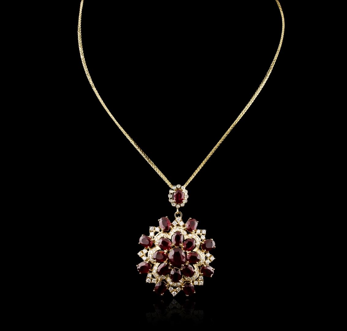 One electronically tested 14KT yellow gold ladies cast ruby and diamond pendant & chain 20.0" long, with a lobster claw clasp with a bright polish finish. Identified with markings of "14K". Condition is new. Containing: One prong set oval modified brilliant cut natural ruby, measuring 11.00. x 9.00. x 5.85mm, approximate weight of 4.86ct., clarity is heavily included, type II, medium dark, moderately strong, strongly purplish red color, (GIA stpR 6/4), cut is good. Seventeen prong set round modified brilliant cut natural rubies, measuring 8.00. - 6.00. x 4.55 mm, approximate total weight of 39.61ct., clarity is moderately included, type II, medium dark, moderately strong, strongly purplish red color, (GIA stpR 6/4), cut is good. Twenty-Four prong set round brilliant cut diamonds, measuring 2.50 - 2.50 x 1.50mm (depth est.) approximate total weight of 24 Stones = 1.37ct. Clarity: SI-1 to SI-2. Color: J - K, Cut is Good. Fifty-Two prong set round brilliant cut diamonds, measuring 1.30 - 1.30 x 0.78mm (depth est.) approximate total weight of 52 Stones = 0.42ct. Clarity: SI-1 to SI-2. Color: J - K, Cut is Good. Colored gemstones are presumed to have been subjected to commonly used enhancement processes. All diamonds and colored gemstones are graded in the mounting, unless otherwise stated. Total Weight of Colored Stones 44.47ct. Total Weight of Diamonds 1.79ct. Total Weight of Pendant & Chain 29.60 grams. GGL Appraised at $8,510.00.