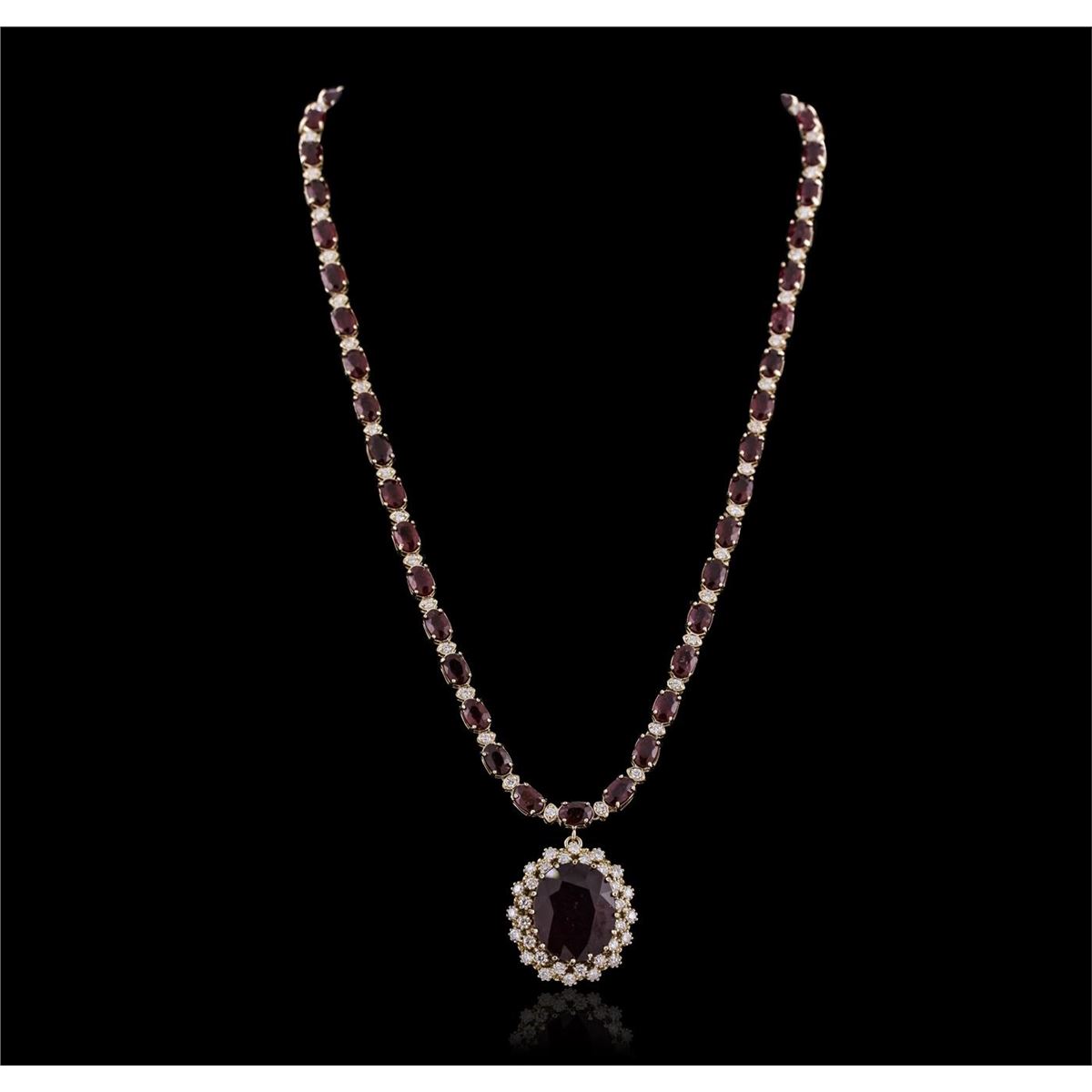 One electronically tested 14KT yellow gold ladies cast & assembled ruby and diamond necklace with a bright polish finish. Seventeen inch length necklace features a ruby and diamond pendant supported by a flexible ruby and diamond ribbon, terminating in a concealed clasp with safety. Identified with markings of "14K". Condition is new, good workmanship. Containing: One prong set oval mixed cut natural ruby, measuring 17.70 x 14.80 x 8.10mm, 8%. bulge factor, approximate weight of 18.48ct., clarity is heavily included, type II, dark, very slightly brownish, slightly purplish red color, (GIA slpR 7/3), cut is good. Transmitting light somewhat diffusely, transparent to translucent. Naturally occurring internal & external characteristics are present. Indications of laboratory high temperature heat treatment, with glass & flux additives. Graded in the setting. Ruby has a low tolerance to rhodium plating, repolishing the surface, & ultrasonic cleaning. Forty-six prong set oval mixed cut natural rubies, measuring 6.00. x 4.00. x 2.70mm, 6%. bulge factor, approximate total weight of 26.22ct., clarity is heavily included, type II, dark, very slightly brownish, slightly purplish red color, (GIA slpR 7/3), cut is good. Transmitting light somewhat diffusely, transparent to translucent. Naturally occurring internal & external characteristics are present. Indications of laboratory high temperature heat treatment, with glass & flux additives. Measurements & the color grade are an average for the group. Graded in the setting. Ruby has a low tolerance to rhodium plating, repolishing the surface, & ultrasonic cleaning. Seventy-Eight prong set round brilliant cut diamonds, measuring 2.20 - 2.00. x 1.26mm (depth est.) approximate total weight of 78 Stones = 2.74ct. Graded in the setting. Clarity: SI-1 to I-1 . Color: G - I. Total Weight of Colored Stones 44.70ct. Total Weight of Diamonds 2.74ct. Total Weight of Necklace 35.81 grams. AIG Appraised at $19,940.00.