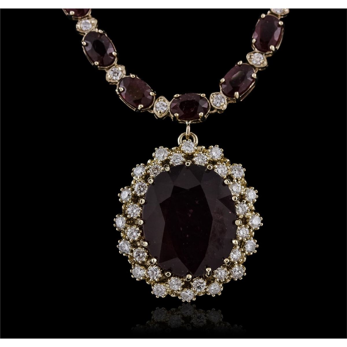 One electronically tested 14KT yellow gold ladies cast & assembled ruby and diamond necklace with a bright polish finish. Seventeen inch length necklace features a ruby and diamond pendant supported by a flexible ruby and diamond ribbon, terminating in a concealed clasp with safety. Identified with markings of "14K". Condition is new, good workmanship. Containing: One prong set oval mixed cut natural ruby, measuring 17.70 x 14.80 x 8.10mm, 8%. bulge factor, approximate weight of 18.48ct., clarity is heavily included, type II, dark, very slightly brownish, slightly purplish red color, (GIA slpR 7/3), cut is good. Transmitting light somewhat diffusely, transparent to translucent. Naturally occurring internal & external characteristics are present. Indications of laboratory high temperature heat treatment, with glass & flux additives. Graded in the setting. Ruby has a low tolerance to rhodium plating, repolishing the surface, & ultrasonic cleaning. Forty-six prong set oval mixed cut natural rubies, measuring 6.00. x 4.00. x 2.70mm, 6%. bulge factor, approximate total weight of 26.22ct., clarity is heavily included, type II, dark, very slightly brownish, slightly purplish red color, (GIA slpR 7/3), cut is good. Transmitting light somewhat diffusely, transparent to translucent. Naturally occurring internal & external characteristics are present. Indications of laboratory high temperature heat treatment, with glass & flux additives. Measurements & the color grade are an average for the group. Graded in the setting. Ruby has a low tolerance to rhodium plating, repolishing the surface, & ultrasonic cleaning. Seventy-Eight prong set round brilliant cut diamonds, measuring 2.20 - 2.00. x 1.26mm (depth est.) approximate total weight of 78 Stones = 2.74ct. Graded in the setting. Clarity: SI-1 to I-1 . Color: G - I. Total Weight of Colored Stones 44.70ct. Total Weight of Diamonds 2.74ct. Total Weight of Necklace 35.81 grams. AIG Appraised at $19,940.00.
