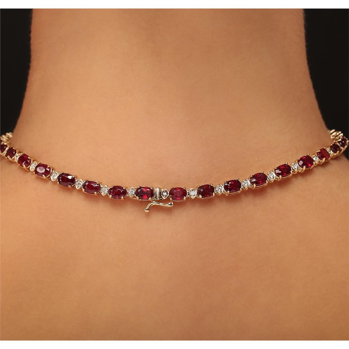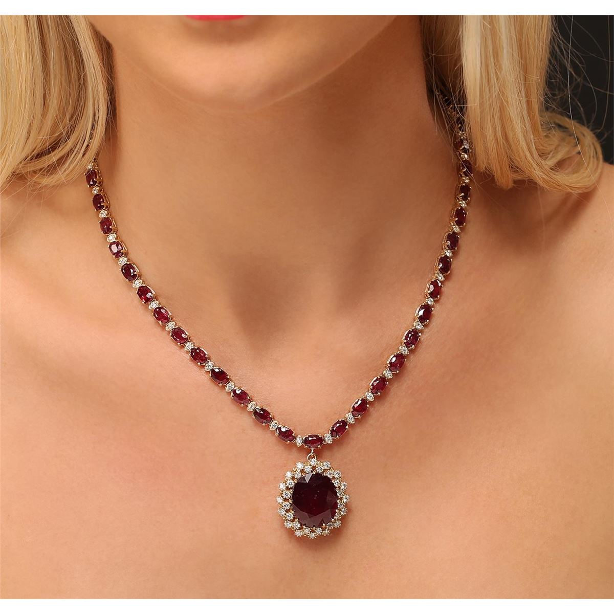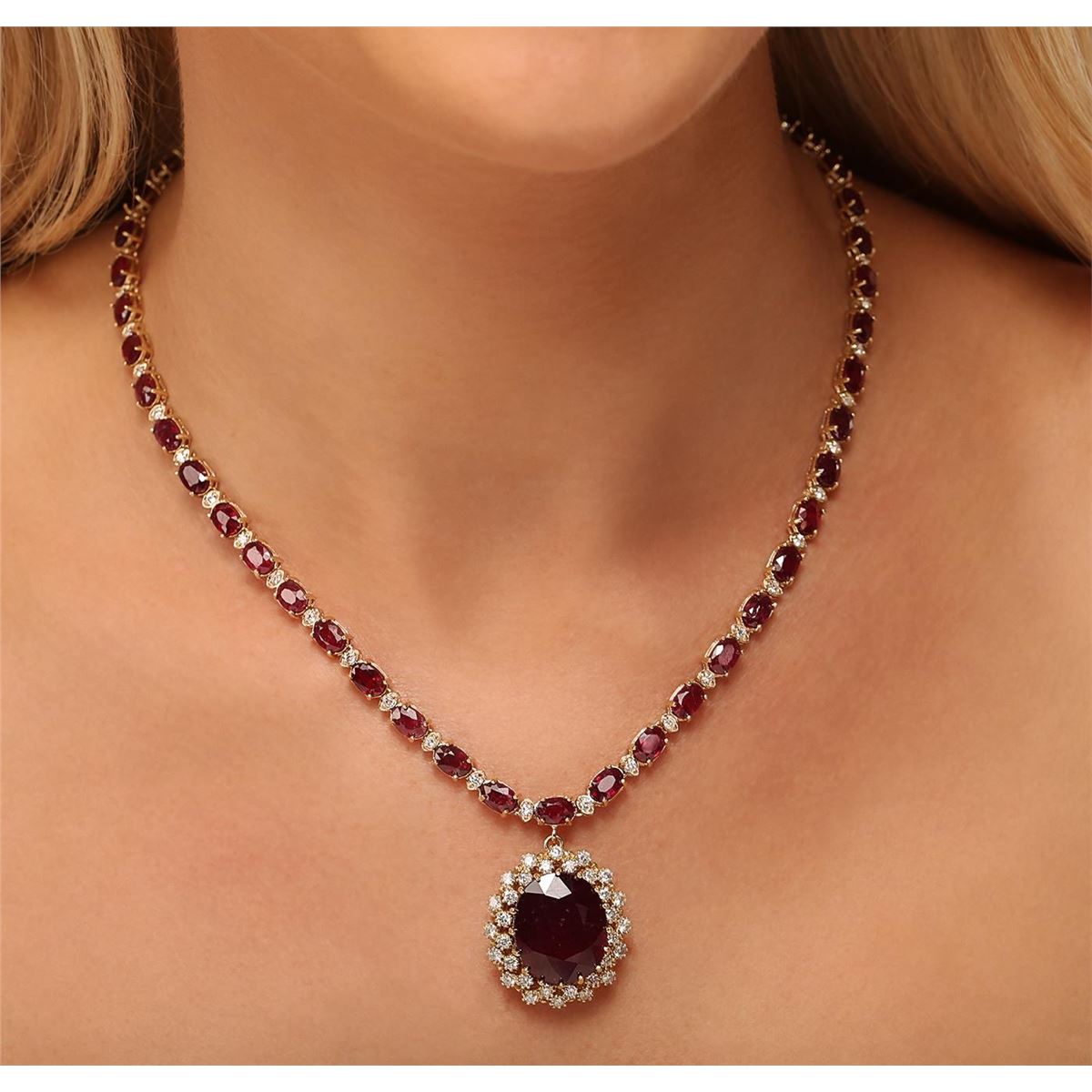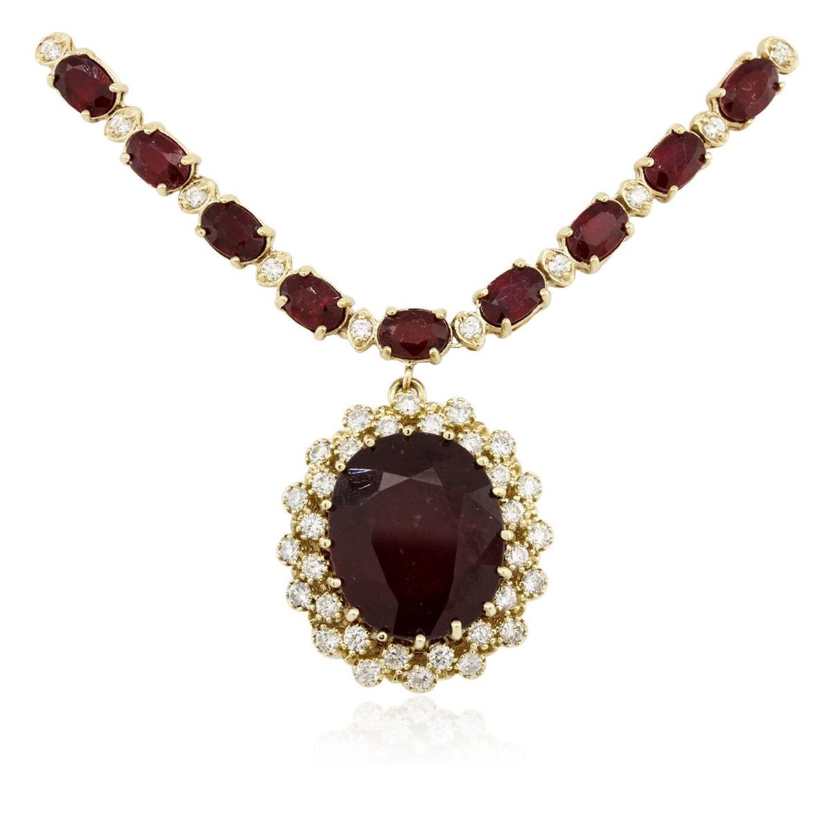 One electronically tested 14KT yellow gold ladies cast & assembled ruby and diamond necklace with a bright polish finish. Seventeen inch length necklace features a ruby and diamond pendant supported by a flexible ruby and diamond ribbon, terminating in a concealed clasp with safety. Identified with markings of "14K". Condition is new, good workmanship. Containing: One prong set oval mixed cut natural ruby, measuring 17.70 x 14.80 x 8.10mm, 8%. bulge factor, approximate weight of 18.48ct., clarity is heavily included, type II, dark, very slightly brownish, slightly purplish red color, (GIA slpR 7/3), cut is good. Transmitting light somewhat diffusely, transparent to translucent. Naturally occurring internal & external characteristics are present. Indications of laboratory high temperature heat treatment, with glass & flux additives. Graded in the setting. Ruby has a low tolerance to rhodium plating, repolishing the surface, & ultrasonic cleaning. Forty-six prong set oval mixed cut natural rubies, measuring 6.00. x 4.00. x 2.70mm, 6%. bulge factor, approximate total weight of 26.22ct., clarity is heavily included, type II, dark, very slightly brownish, slightly purplish red color, (GIA slpR 7/3), cut is good. Transmitting light somewhat diffusely, transparent to translucent. Naturally occurring internal & external characteristics are present. Indications of laboratory high temperature heat treatment, with glass & flux additives. Measurements & the color grade are an average for the group. Graded in the setting. Ruby has a low tolerance to rhodium plating, repolishing the surface, & ultrasonic cleaning. Seventy-Eight prong set round brilliant cut diamonds, measuring 2.20 - 2.00. x 1.26mm (depth est.) approximate total weight of 78 Stones = 2.74ct. Graded in the setting. Clarity: SI-1 to I-1 . Color: G - I. Total Weight of Colored Stones 44.70ct. Total Weight of Diamonds 2.74ct. Total Weight of Necklace 35.81 grams. AIG Appraised at $19,940.00.
