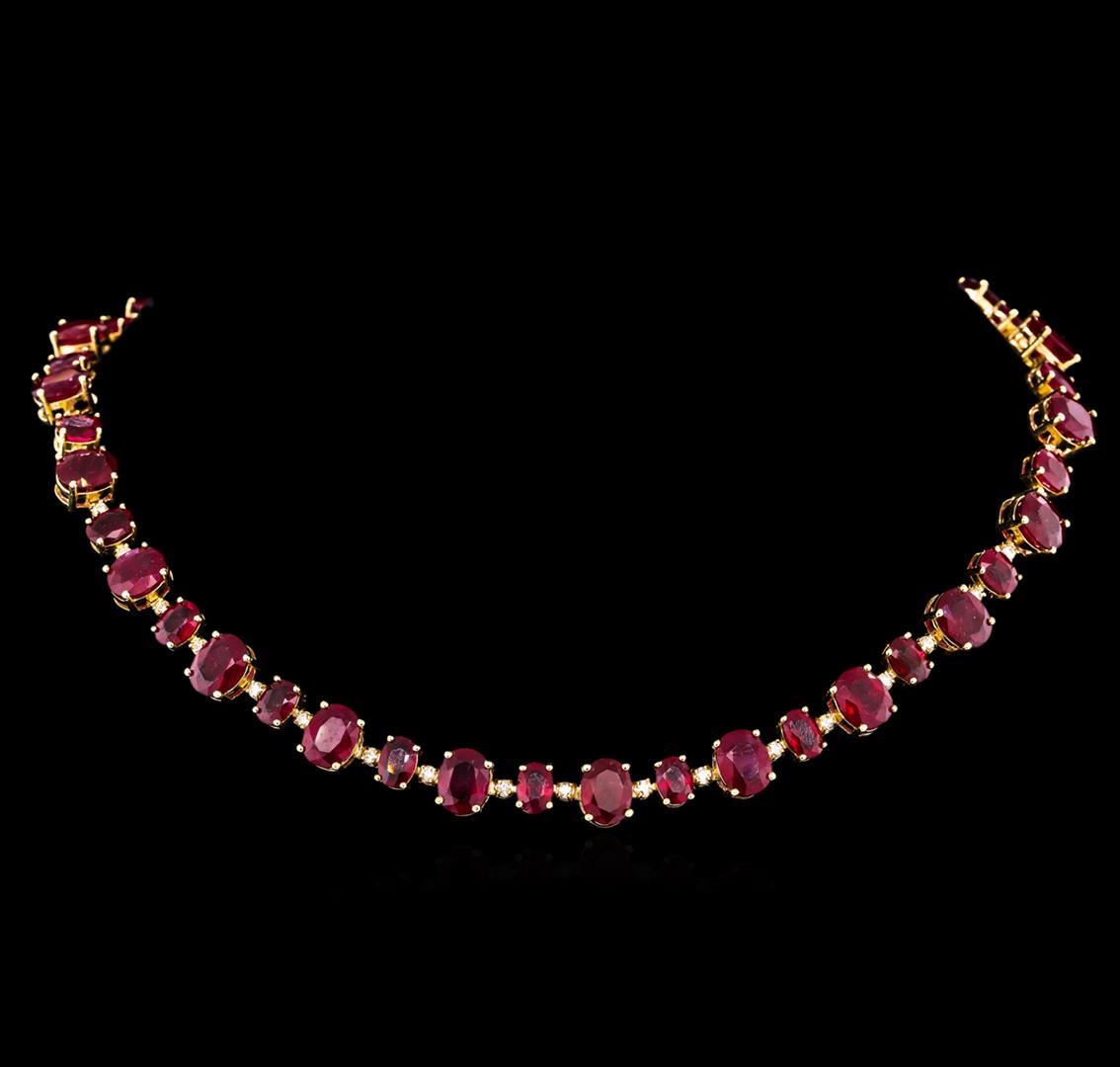 One electronically tested 14KT yellow gold Ladies combination cast & assembled necklace with a hidden box clasp with a bright polish finish. Condition is new. Measurements: 16.5" in length. Identified with markings of "14K". Containing: Twenty-one prong set oval modified brilliant cut natural rubies, measuring 8.90 x 7.00 x 3.90mm, approximate. Total Weight of 41.37ct., clarity is heavily included, type II, medium dark, moderately strong, strongly purplish red color, (GIA stpR 6/4), cut is good. Twenty-two prong set oval modified brilliant cut natural rubies, measuring 6.80 x 5.10 x 2.30mm, approximate. Total Weight of 3.52ct., clarity is heavily included, medium dark, moderately strong, strongly purplish red color, (GIA stpR 6/4), cut is good. Colored gemstones are presumed to have been subjected to commonly used color/clarity enhancement processes. Forty-Four prong set round brilliant cut diamonds, measuring 2.00 - 2.00 x 1.20mm (depth est.) approximate. Total Weight of 44 Stones = 1.29ct. Clarity: I-1 to I-2. Color: J - K, Cut is Good. Total Weight of Colored Stones 44.89ct. Total Weight of Diamonds 1.29ct. Total Weight of Necklace 46.30 grams. GGL Appraised at $30,655.00.