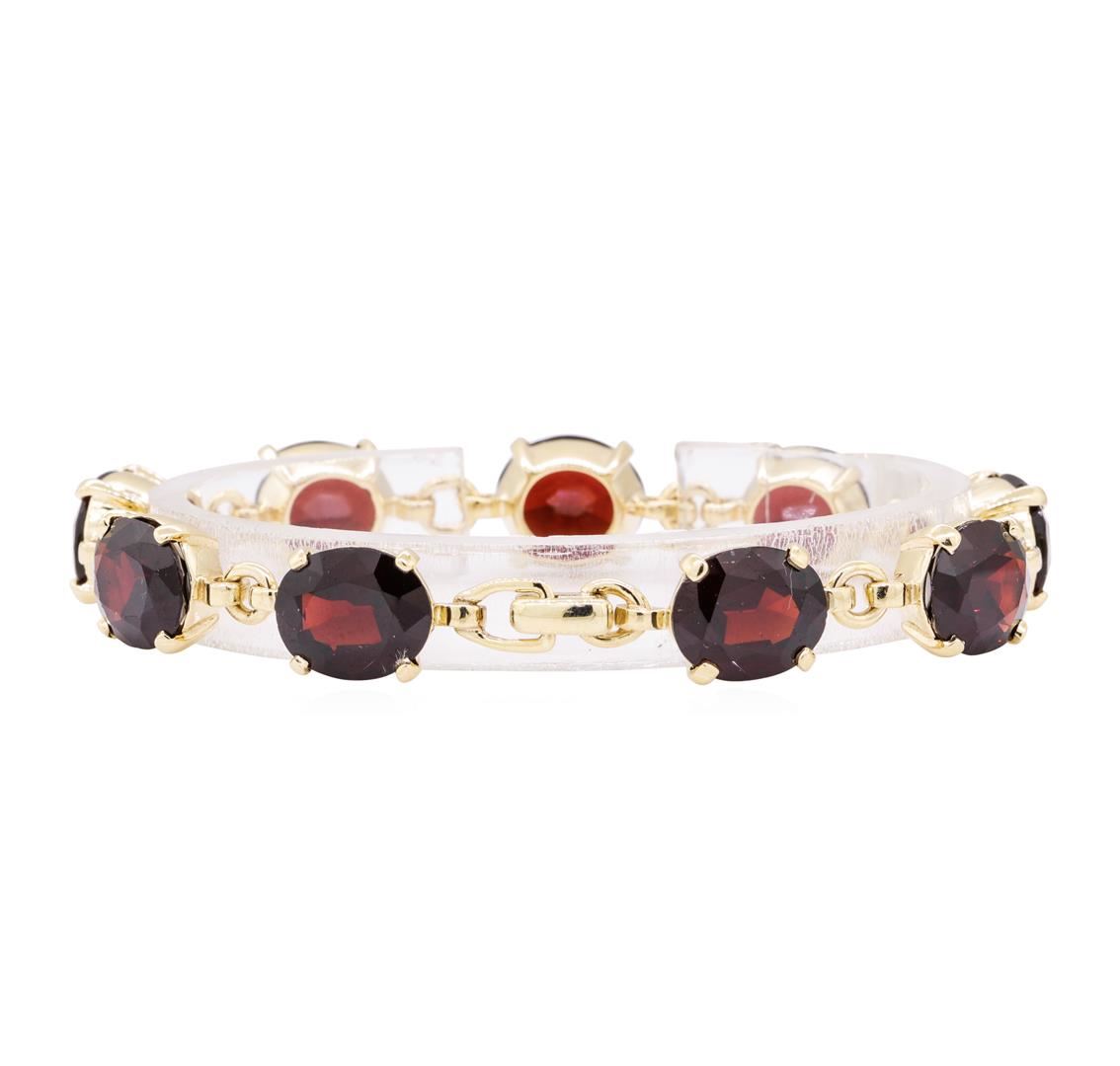 One electronically tested 14KT yellow gold lady's combination cast & assembled fashion bracelet with a double foldover buckle clasp with a bright polish finish. The featured lady's bracelet measures approximately seven inches in length. Identified with markings of '14K'. Condition is new, good workmanship. Containing: Nine prong set oval modified brilliant cut natural pyrope garnets, measuring 12.00 x 10.00 x 5.75mm, (depth est.) approximate total weight of 49.00ct.,, Clarity is eye clean, dark, very slightly brownish, red color, (GIA R 7/3), cut is good. Transmitting light with no distortion, transparent. Colored gemstones are presumed to have been subjected to commonly used enhancement processes. Graded in the setting. Total Weight of Colored Stones 49.00ct. Total Weight of Bracelet 29.10gm. GAS Appraised.