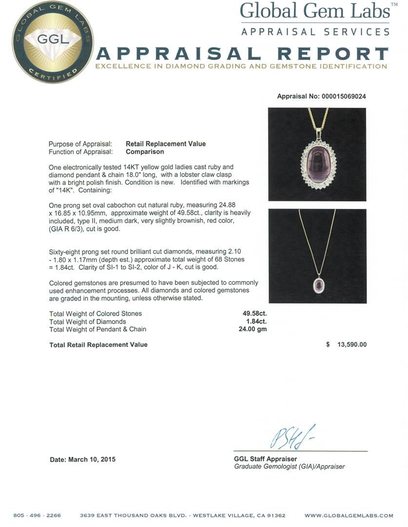One electronically tested 14KT yellow gold ladies cast ruby and diamond pendant & chain 18.0" long, with a lobster claw clasp with a bright polish finish. Identified with markings of "14K". Condition is new. Containing: One prong set oval cabochon cut natural ruby, measuring 24.88 x 16.85 x 10.95mm, approximate weight of 49.58ct., clarity is heavily included, type II, medium dark, very slightly brownish, red color, (GIA R 6/3), cut is good. Sixty-Eight prong set round brilliant cut diamonds, measuring 2.10 - 1.80 x 1.17mm (depth est.) approximate total weight of 68 Stones = 1.84ct. Clarity: SI-1 to SI-2. Color: J - K, Cut is Good. Colored gemstones are presumed to have been subjected to commonly used enhancement processes. All diamonds and colored gemstones are graded in the mounting, unless otherwise stated. Total Weight of Colored Stones 49.58ct. Total Weight of Diamonds 1.84ct. Total Weight of Pendant & Chain 24.00 grams. GGL Appraised at $13,590.00.