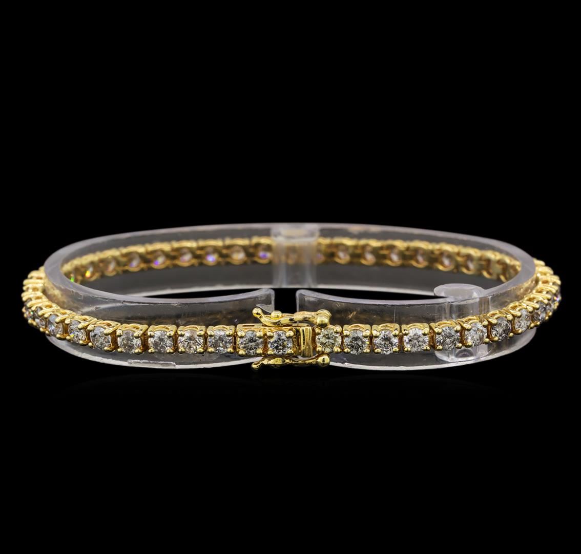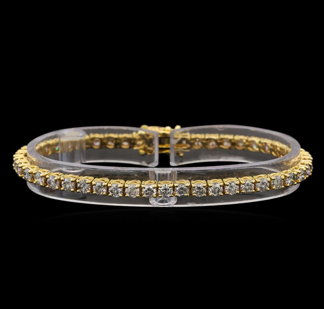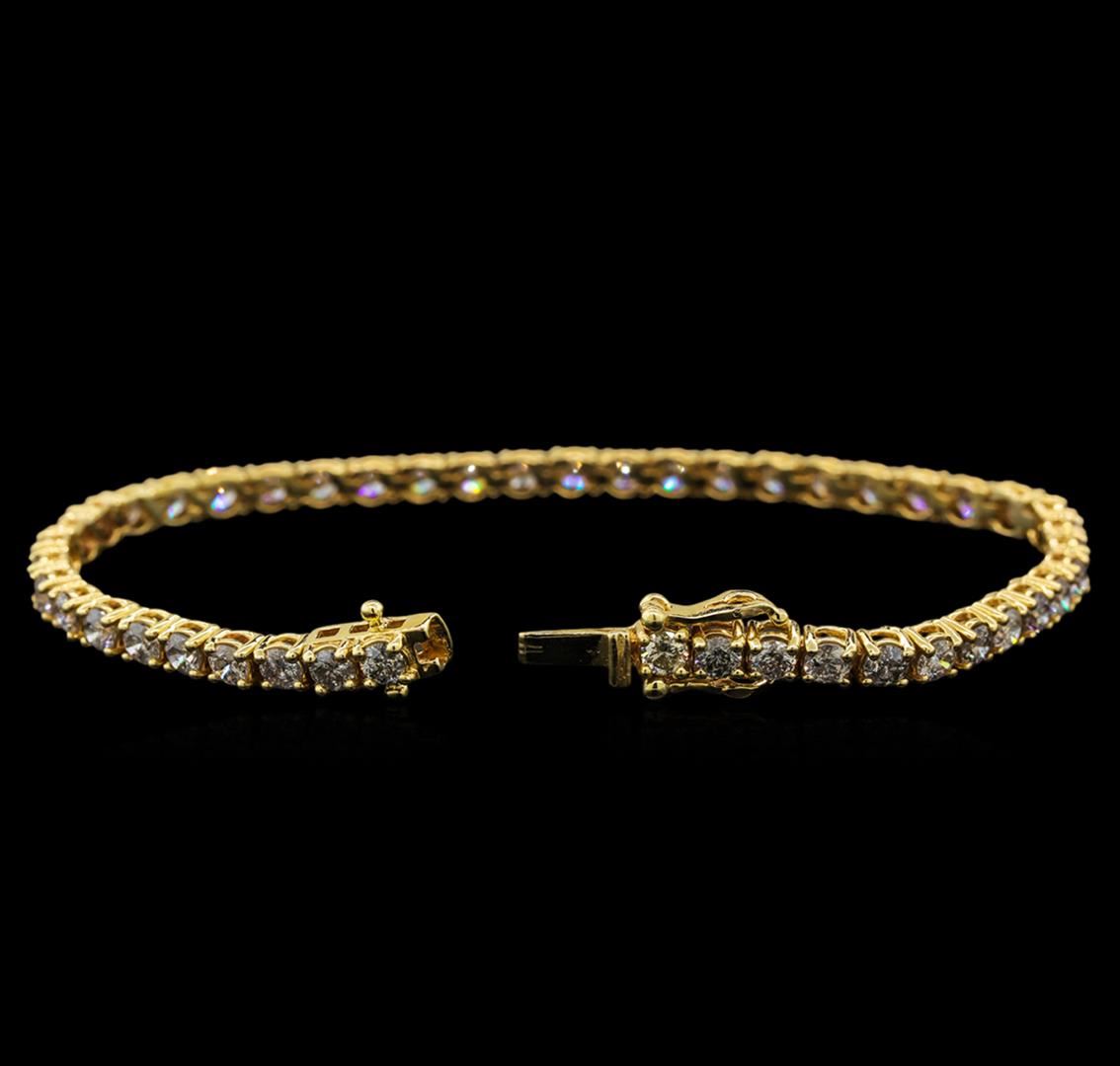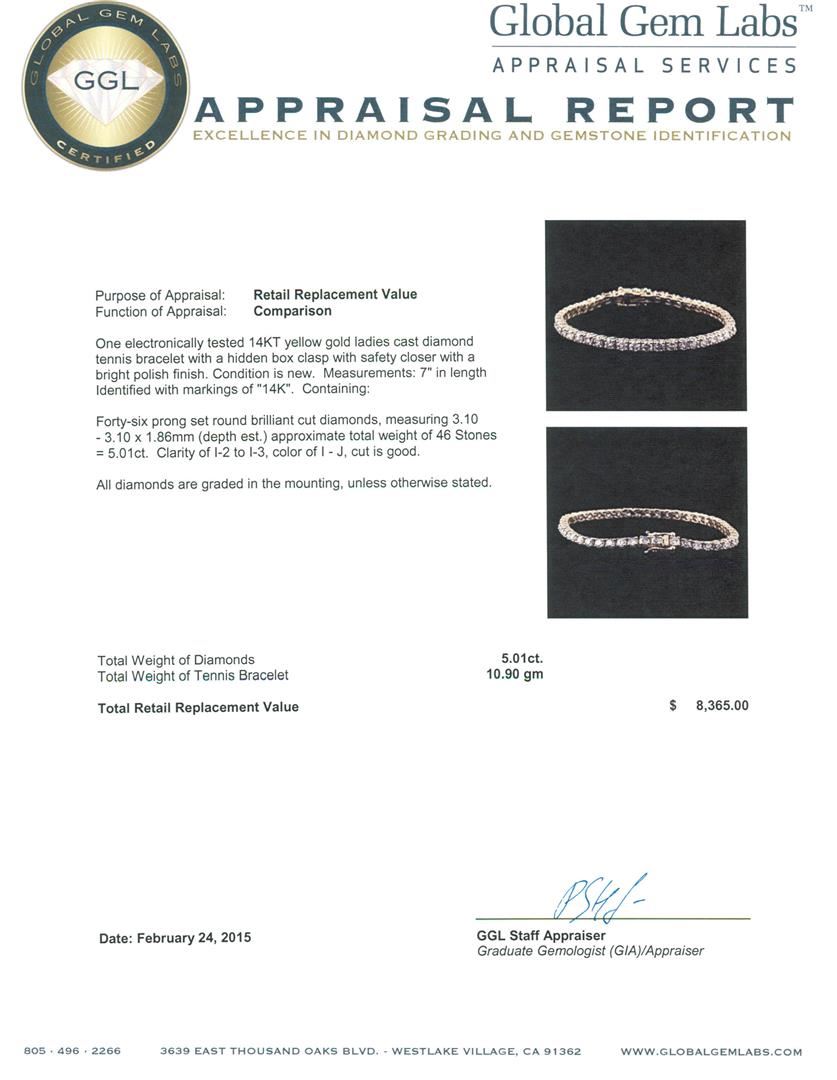 One electronically tested 14KT yellow gold ladies cast diamond tennis bracelet with a hidden box clasp with safety closer with a bright polish finish. Measurements: 7" in length Identified with markings of "14K". Condition is new. Containing: Forty-Six prong set round brilliant cut diamonds, measuring 3.10 - 3.10 x 1.86mm (depth est.) approximate total weight of 46 Stones = 5.01ct. Clarity: I-2 to I-3. Color: I - J, Cut is Good. All diamonds are graded in the mounting, unless otherwise stated. Total Weight of Diamonds 5.01ct. Total Weight of Tennis Bracelet 10.90 grams. GGL Appraised at $8,365.00.