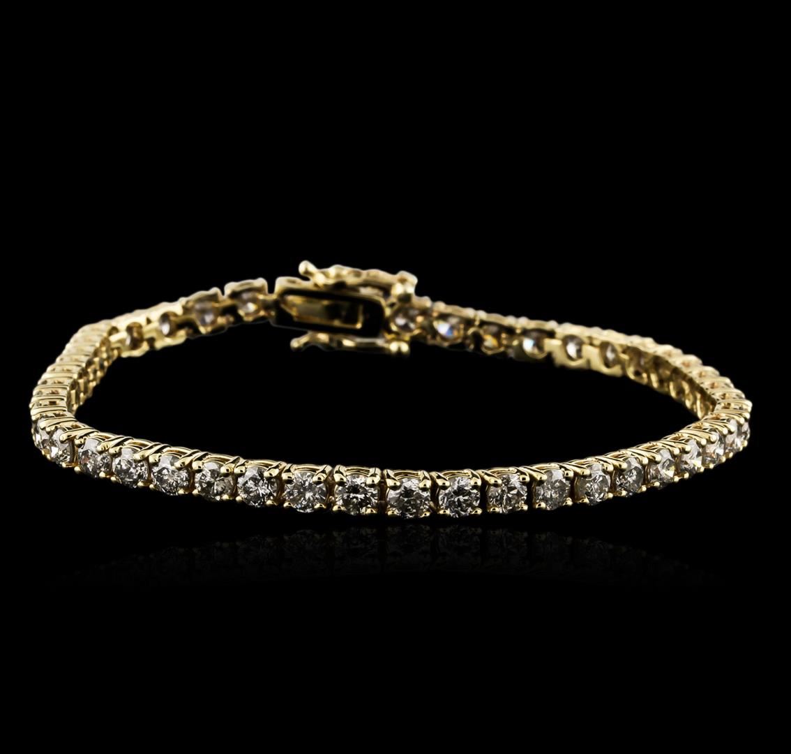 One electronically tested 14KT yellow gold ladies cast diamond tennis bracelet with a hidden box clasp with safety closer with a bright polish finish. Measurements: 7" in length Identified with markings of "14K". Condition is new. Containing: Forty-Six prong set round brilliant cut diamonds, measuring 3.10 - 3.10 x 1.86mm (depth est.) approximate total weight of 46 Stones = 5.01ct. Clarity: I-2 to I-3. Color: I - J, Cut is Good. All diamonds are graded in the mounting, unless otherwise stated. Total Weight of Diamonds 5.01ct. Total Weight of Tennis Bracelet 10.90 grams. GGL Appraised at $8,365.00.