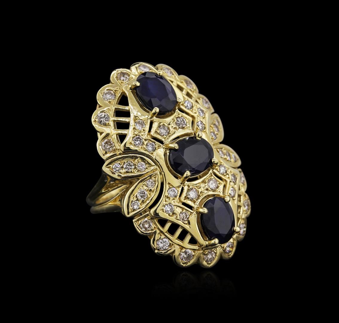 One electronically tested 14KT yellow gold ladies cast sapphire and diamond ring with a bright polish finish. Identified with markings of "14K". Condition is new. Containing: Three prong set oval oval modified brilliant cut natural blue sapphires, measuring 8.20 x 6.10 x 3.97mm, approximate total weight of 5.01ct., clarity is heavily included, type II, dark, moderately strong, blue color, (GIA B 7/4), cut is good. Forty-Four prong set round brilliant cut diamonds, measuring 2.00 - 2.00 x 1.20mm (depth est.) approximate total weight of 44 Stones = 1.29ct. Clarity: SI-1 to I-1. Color: K - L, Cut is Good. Diamonds and colored gemstones are graded in the mounting, unless otherwise stated. Colored gemstones are presumed to have been subjected to commonly used enhancement processes. Total Weight of Colored Stones 5.01ct. Total Weight of Diamonds 1.29ct. Total Weight of Ring 13.40 grams. GGL Appraised at $5,875.00.
