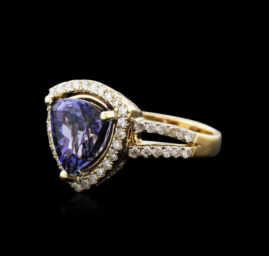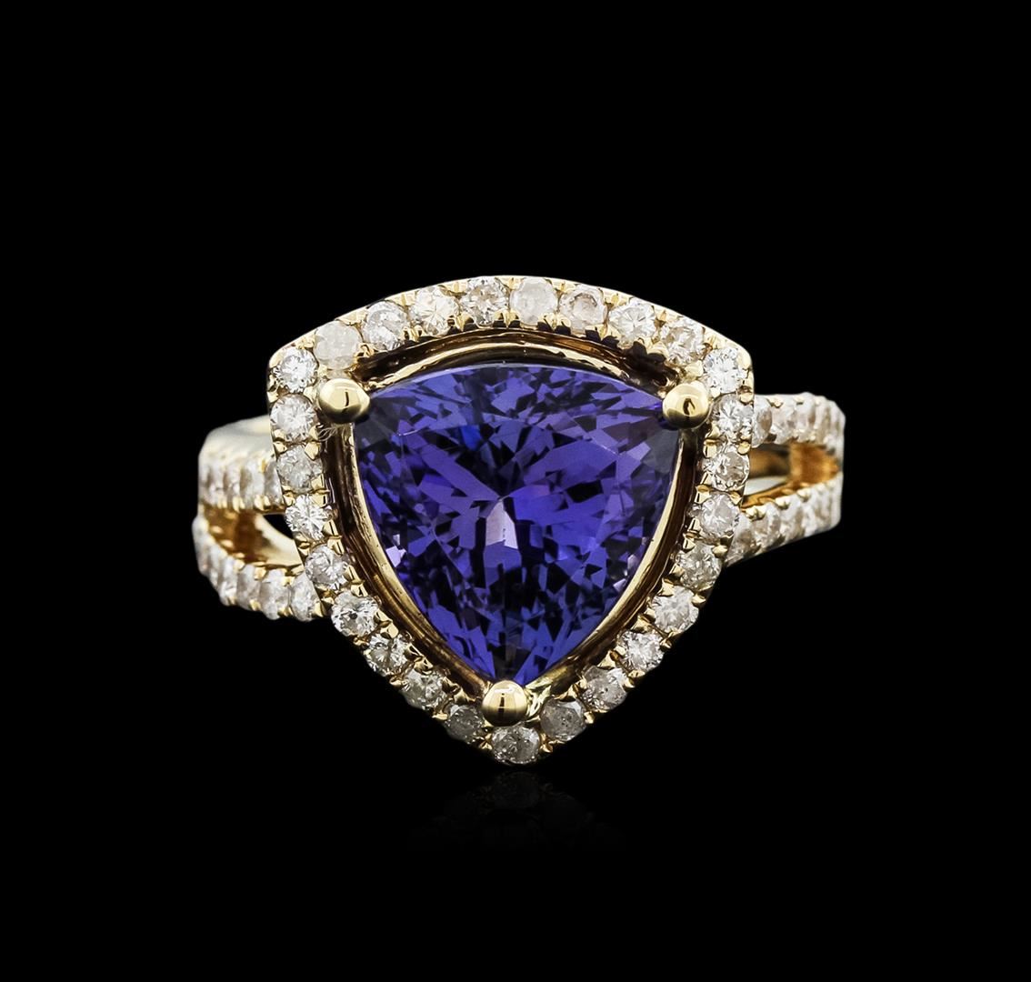 One electronically tested 14KT yellow gold ladies cast tanzanite and diamond ring with a bright polish finish. Trademark is Orianne. Identified with markings of "14K". Condition is new. Containing: One prong set triangle modified brilliant cut natural tanzanite, measuring 11.00 x 11.00 x 6.90mm, approximate weight of 5.03ct., clarity is eye clean, type I, medium, very slightly grayish, bluish violet color, (GIA bV 5/3), cut is good. Fifty-One prong set round brilliant cut diamonds, measuring 1.50 - 1.50 x 0.90mm (depth est.) approximate total weight of 51 Stones = 0.63ct. Clarity: I-1 to I-2. Color: J - K, Cut is Good. All diamonds and colored gemstones are graded in the mounting, unless otherwise stated. Colored gemstones are presumed to have been subjected to commonly used enhancement processes.. Total Weight of Colored Stones 5.03ct. Total Weight of Diamonds 0.63ct. Total Weight of Ring 9.30 grams. GGL Appraised at $7,655.00.