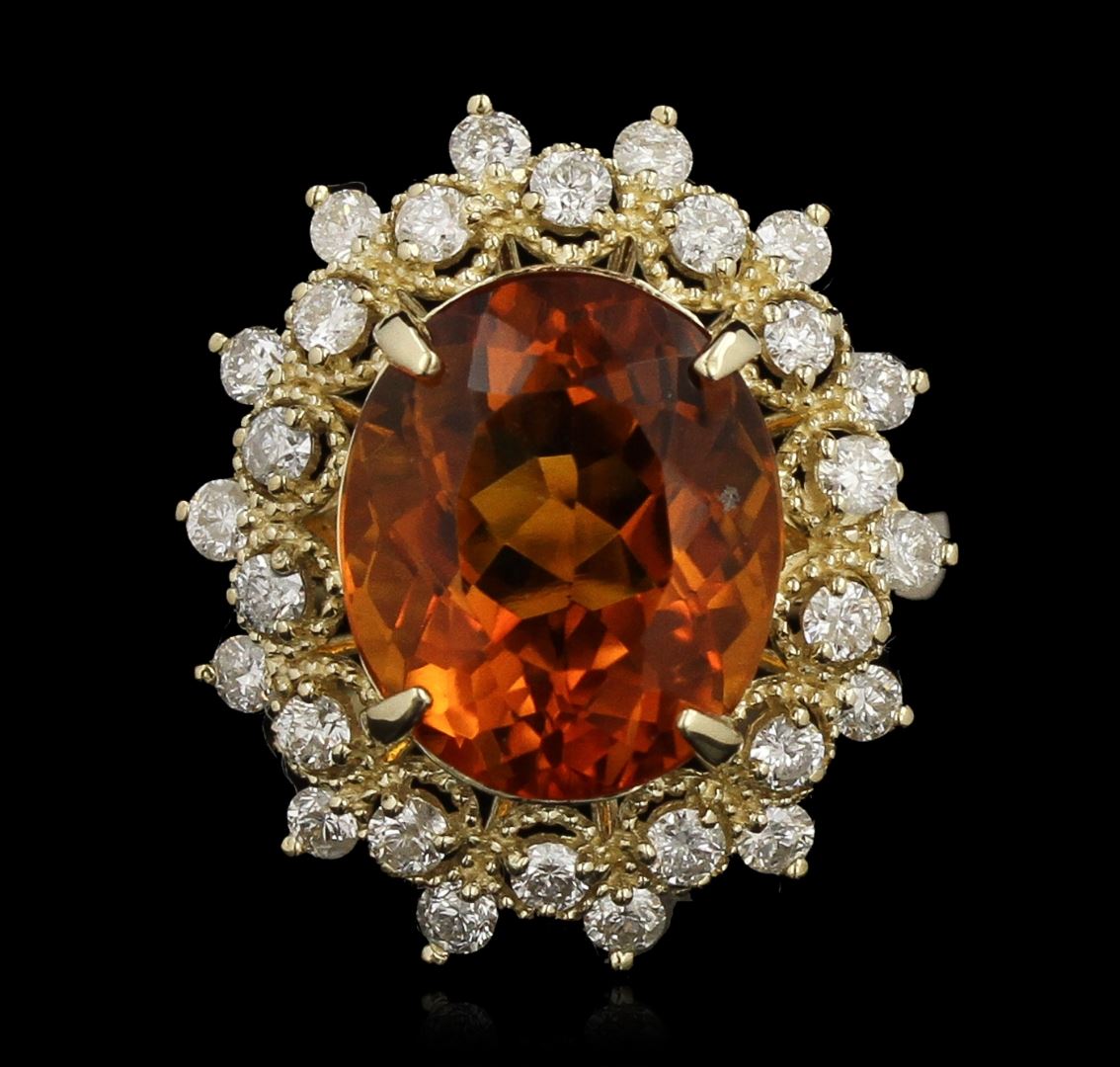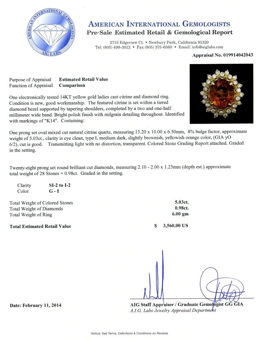 One electronically tested 14KT yellow gold ladies cast citrine and diamond ring. Condition is new, good workmanship. The featured citrine is set within a tiered diamond bezel supported by tapering shoulders, completed by a two and one-half millimeter wide band. Bright polish finish with milgrain detailing throughout. Identified with markings of "K14". Containing: One prong set oval mixed cut natural citrine quartz, measuring 13.20 x 10.00 x 6.50mm, 8% bulge factor, approximate weight of 5.03ct, clarity is eye clean, type I, medium dark, slightly brownish, yellowish orange color, (GIA yO 6/2), cut is good. Transmitting light with no distortion, transparent. Colored Stone Grading Report attached. Graded in the setting. Twenty-Eight prong set round brilliant cut diamonds, measuring 2.10 - 2.00 x 1.23mm (depth est.) approximate. Total Weight of 28 Stones = 0.98ct. Graded in the setting. Clarity: SI-2 to I-2. Color: G - I. Total Weight of Colored Stones 5.03ct. Total Weight of Diamonds 0.98ct. Total Weight of Ring 6.00 grams. AIG Appraised at $3,560.00.