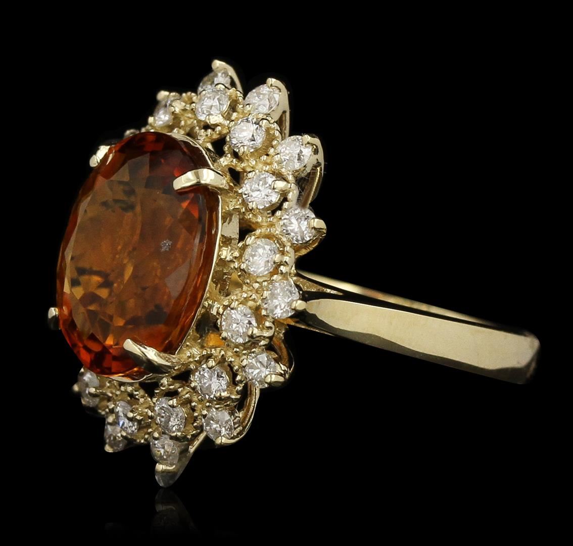 One electronically tested 14KT yellow gold ladies cast citrine and diamond ring. Condition is new, good workmanship. The featured citrine is set within a tiered diamond bezel supported by tapering shoulders, completed by a two and one-half millimeter wide band. Bright polish finish with milgrain detailing throughout. Identified with markings of "K14". Containing: One prong set oval mixed cut natural citrine quartz, measuring 13.20 x 10.00 x 6.50mm, 8% bulge factor, approximate weight of 5.03ct, clarity is eye clean, type I, medium dark, slightly brownish, yellowish orange color, (GIA yO 6/2), cut is good. Transmitting light with no distortion, transparent. Colored Stone Grading Report attached. Graded in the setting. Twenty-Eight prong set round brilliant cut diamonds, measuring 2.10 - 2.00 x 1.23mm (depth est.) approximate. Total Weight of 28 Stones = 0.98ct. Graded in the setting. Clarity: SI-2 to I-2. Color: G - I. Total Weight of Colored Stones 5.03ct. Total Weight of Diamonds 0.98ct. Total Weight of Ring 6.00 grams. AIG Appraised at $3,560.00.