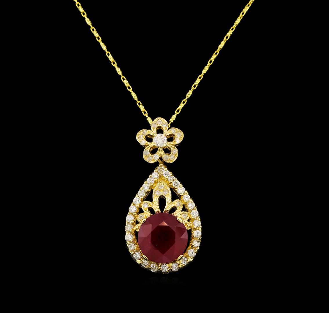 One electronically tested 14KT yellow gold ladies cast ruby and diamond pendant & chain 18.0" long, fancy link with a lobster claw clasp with a bright polish finish. Identified with markings of "14K". Condition is new. Containing: One prong set round modified brilliant cut natural ruby, measuring 9.91 - 9.91 x 6.44 mm, approximate weight of 5.06ct., clarity is heavily included, type II, medium dark, moderately strong, strongly purplish red color, (GIA stpR 6/4), cut is good. One prong set round brilliant cut diamond, measuring 2.80 - 2.80 x 1.68mm (depth est.) approximate weight of 0.08ct. Clarity: I-1. Color: K, Cut is Good. Fifty prong set round brilliant cut diamonds, measuring 1.50 - 1.30 x 0.84mm (depth est.) approximate total weight of 50 Stones = 0.50ct. Clarity: SI-2 to I-1. Color: J - K. Colored gemstones are presumed to have been subjected to commonly used enhancement processes. All diamonds and colored gemstones are graded in the mounting, unless otherwise stated. Total Weight of Colored Stones 5.06ct. Total Weight of Diamonds 0.58ct. Total Weight of Pendant & Chain 7.50 grams. GGL Appraised at $3,735.00.