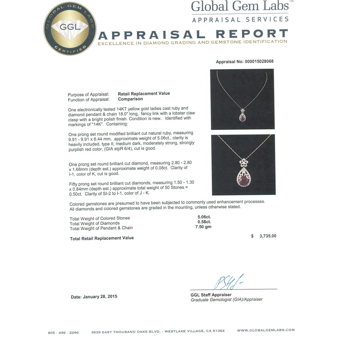 One electronically tested 14KT yellow gold ladies cast ruby and diamond pendant & chain 18.0" long, fancy link with a lobster claw clasp with a bright polish finish. Identified with markings of "14K". Condition is new. Containing: One prong set round modified brilliant cut natural ruby, measuring 9.91 - 9.91 x 6.44 mm, approximate weight of 5.06ct., clarity is heavily included, type II, medium dark, moderately strong, strongly purplish red color, (GIA stpR 6/4), cut is good. One prong set round brilliant cut diamond, measuring 2.80 - 2.80 x 1.68mm (depth est.) approximate weight of 0.08ct. Clarity: I-1. Color: K, Cut is Good. Fifty prong set round brilliant cut diamonds, measuring 1.50 - 1.30 x 0.84mm (depth est.) approximate total weight of 50 Stones = 0.50ct. Clarity: SI-2 to I-1. Color: J - K. Colored gemstones are presumed to have been subjected to commonly used enhancement processes. All diamonds and colored gemstones are graded in the mounting, unless otherwise stated. Total Weight of Colored Stones 5.06ct. Total Weight of Diamonds 0.58ct. Total Weight of Pendant & Chain 7.50 grams. GGL Appraised at $3,735.00.