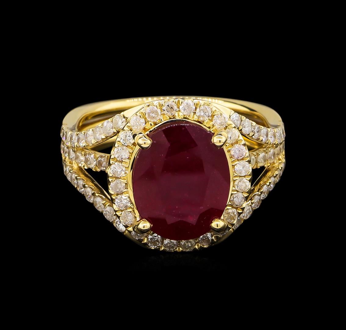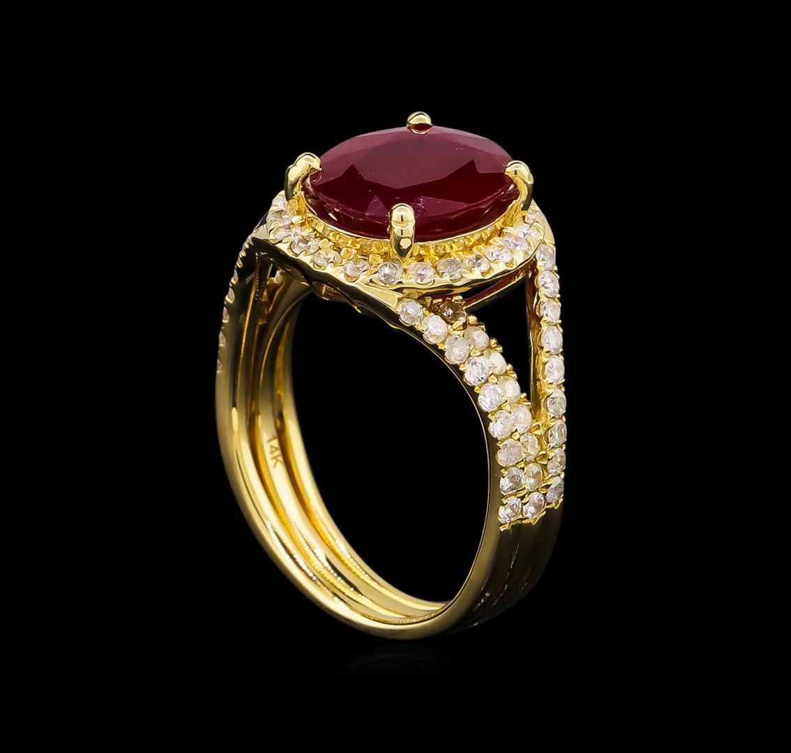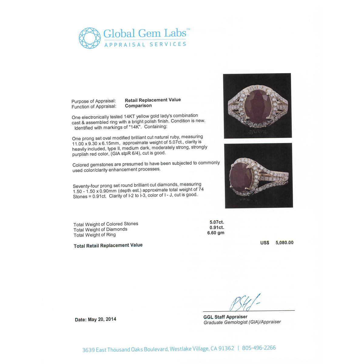 One electronically tested 14KT yellow gold Ladies combination cast & assembled ring with a bright polish finish. Condition is new. Identified with markings of "14K". Containing: One prong set oval modified brilliant cut natural ruby, measuring 11.00 x 9.30 x 6.15mm, approximate weight of 5.07ct., clarity is heavily included, type II, medium dark, moderately strong, strongly purplish red color, (GIA stpR 6/4), cut is good. Colored gemstones are presumed to have been subjected to commonly used color/clarity enhancement processes. Seventy-Four prong set round brilliant cut diamonds, measuring 1.50 - 1.50 x 0.90mm (depth est.) approximate. Total Weight of 74 Stones = 0.91ct. Clarity: I-2 to I-3. Color: I - J, Cut is Good. Total Weight of Colored Stones 5.07ct. Total Weight of Diamonds 0.91ct. Total Weight of Ring 6.60 grams. GGL Appraised at $5,080.00.