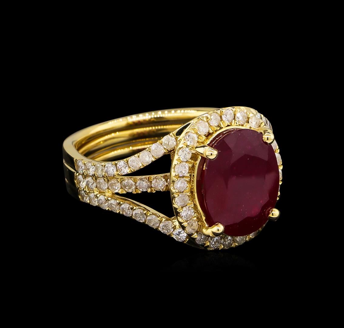 One electronically tested 14KT yellow gold Ladies combination cast & assembled ring with a bright polish finish. Condition is new. Identified with markings of "14K". Containing: One prong set oval modified brilliant cut natural ruby, measuring 11.00 x 9.30 x 6.15mm, approximate weight of 5.07ct., clarity is heavily included, type II, medium dark, moderately strong, strongly purplish red color, (GIA stpR 6/4), cut is good. Colored gemstones are presumed to have been subjected to commonly used color/clarity enhancement processes. Seventy-Four prong set round brilliant cut diamonds, measuring 1.50 - 1.50 x 0.90mm (depth est.) approximate. Total Weight of 74 Stones = 0.91ct. Clarity: I-2 to I-3. Color: I - J, Cut is Good. Total Weight of Colored Stones 5.07ct. Total Weight of Diamonds 0.91ct. Total Weight of Ring 6.60 grams. GGL Appraised at $5,080.00.