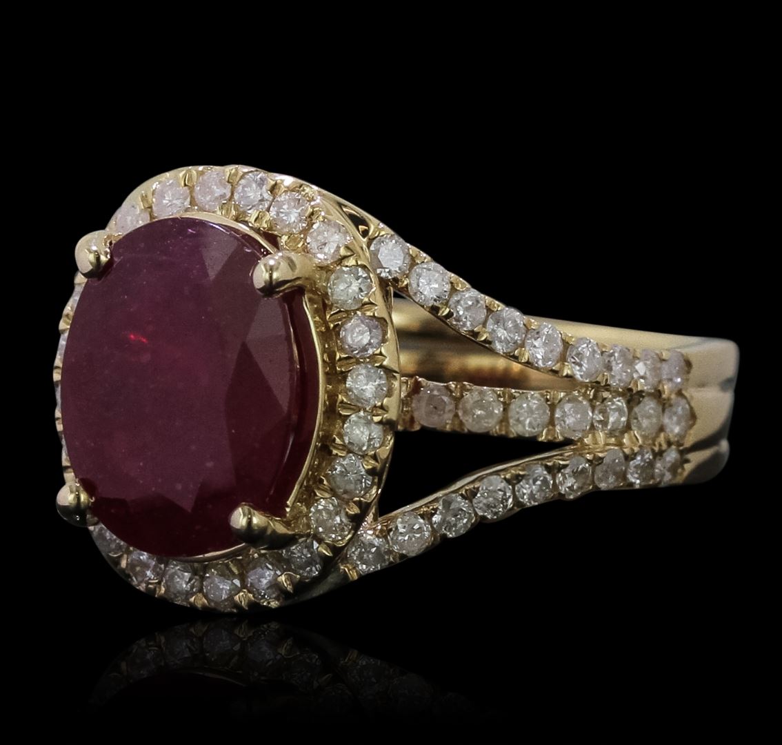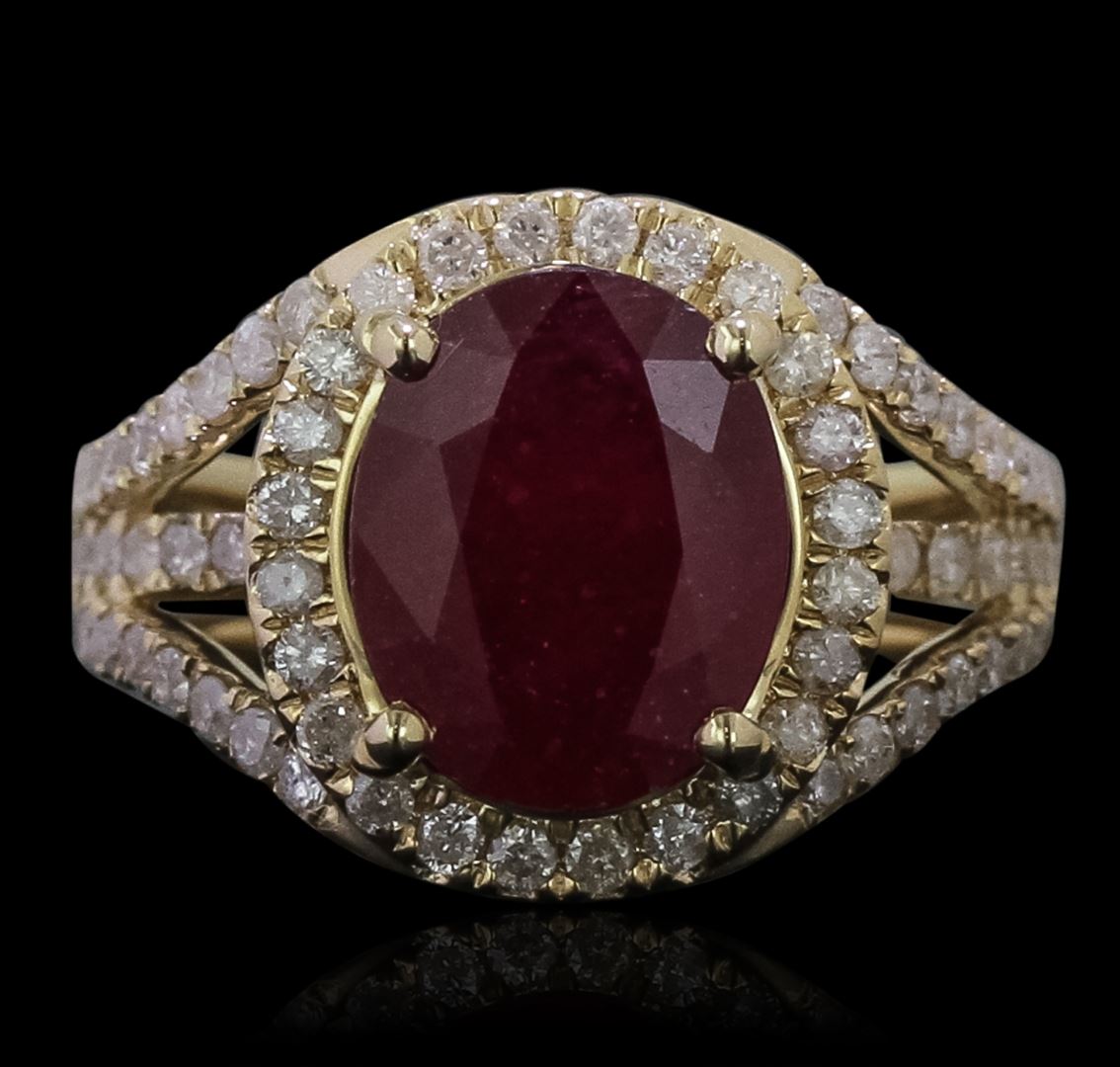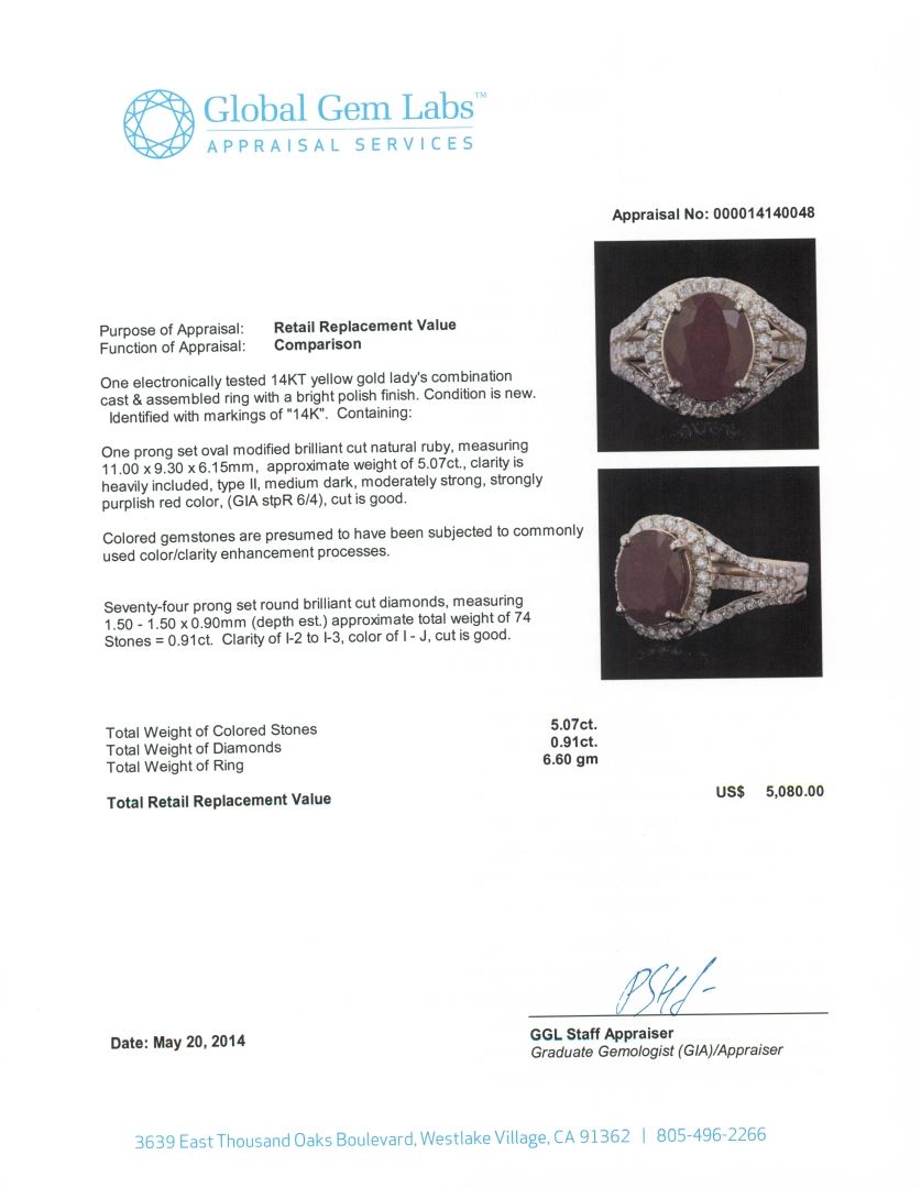 One electronically tested 14KT yellow gold Ladies combination cast & assembled ring with a bright polish finish. Condition is new. Identified with markings of "14K". Containing: One prong set oval modified brilliant cut natural ruby, measuring 11.00 x 9.30 x 6.15mm, approximate weight of 5.07ct., clarity is heavily included, type II, medium dark, moderately strong, strongly purplish red color, (GIA stpR 6/4), cut is good. Colored gemstones are presumed to have been subjected to commonly used color/clarity enhancement processes. Seventy-Four prong set round brilliant cut diamonds, measuring 1.50 - 1.50 x 0.90mm (depth est.) approximate. Total Weight of 74 Stones = 0.91ct. Clarity: I-2 to I-3. Color: I - J, Cut is Good. Total Weight of Colored Stones 5.07ct. Total Weight of Diamonds 0.91ct. Total Weight of Ring 6.60 grams. GGL Appraised at $5,080.00.