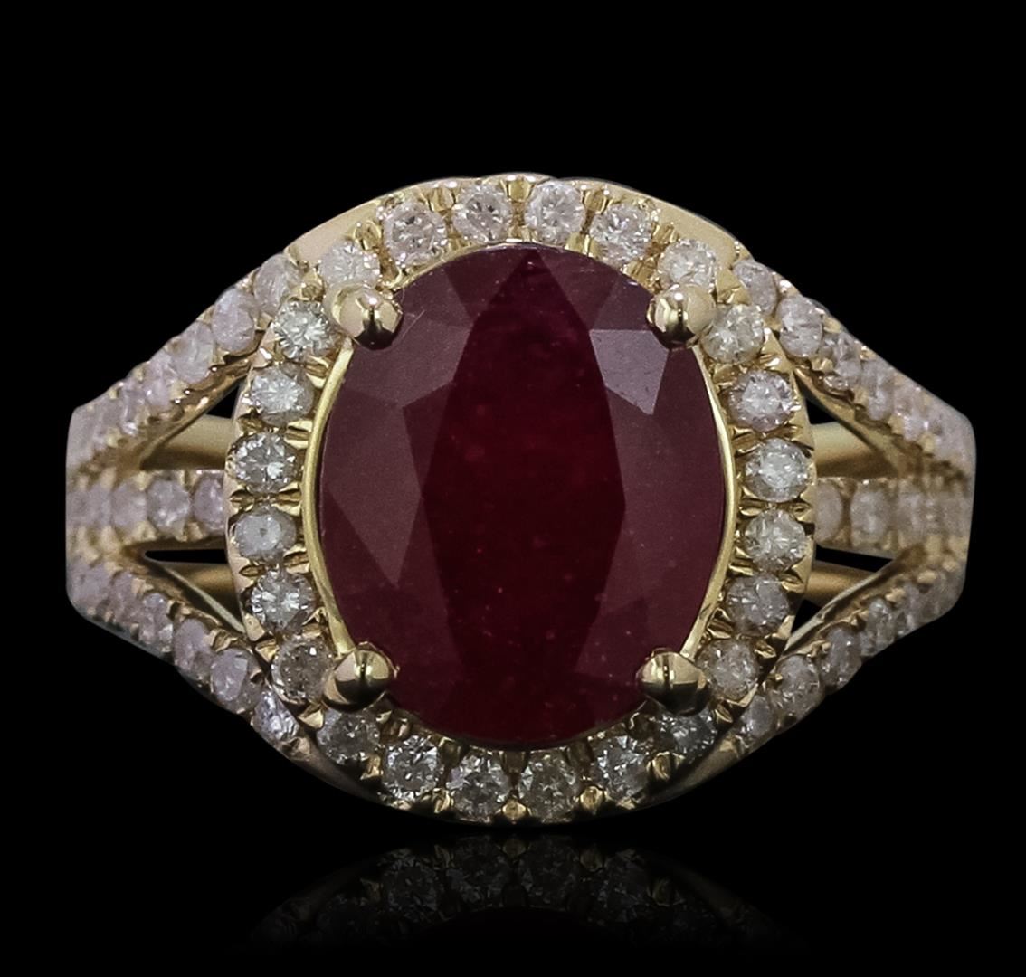One electronically tested 14KT yellow gold Ladies combination cast & assembled ring with a bright polish finish. Condition is new. Identified with markings of "14K". Containing: One prong set oval modified brilliant cut natural ruby, measuring 11.00 x 9.30 x 6.15mm, approximate weight of 5.07ct., clarity is heavily included, type II, medium dark, moderately strong, strongly purplish red color, (GIA stpR 6/4), cut is good. Colored gemstones are presumed to have been subjected to commonly used color/clarity enhancement processes. Seventy-Four prong set round brilliant cut diamonds, measuring 1.50 - 1.50 x 0.90mm (depth est.) approximate. Total Weight of 74 Stones = 0.91ct. Clarity: I-2 to I-3. Color: I - J, Cut is Good. Total Weight of Colored Stones 5.07ct. Total Weight of Diamonds 0.91ct. Total Weight of Ring 6.60 grams. GGL Appraised at $5,080.00.
