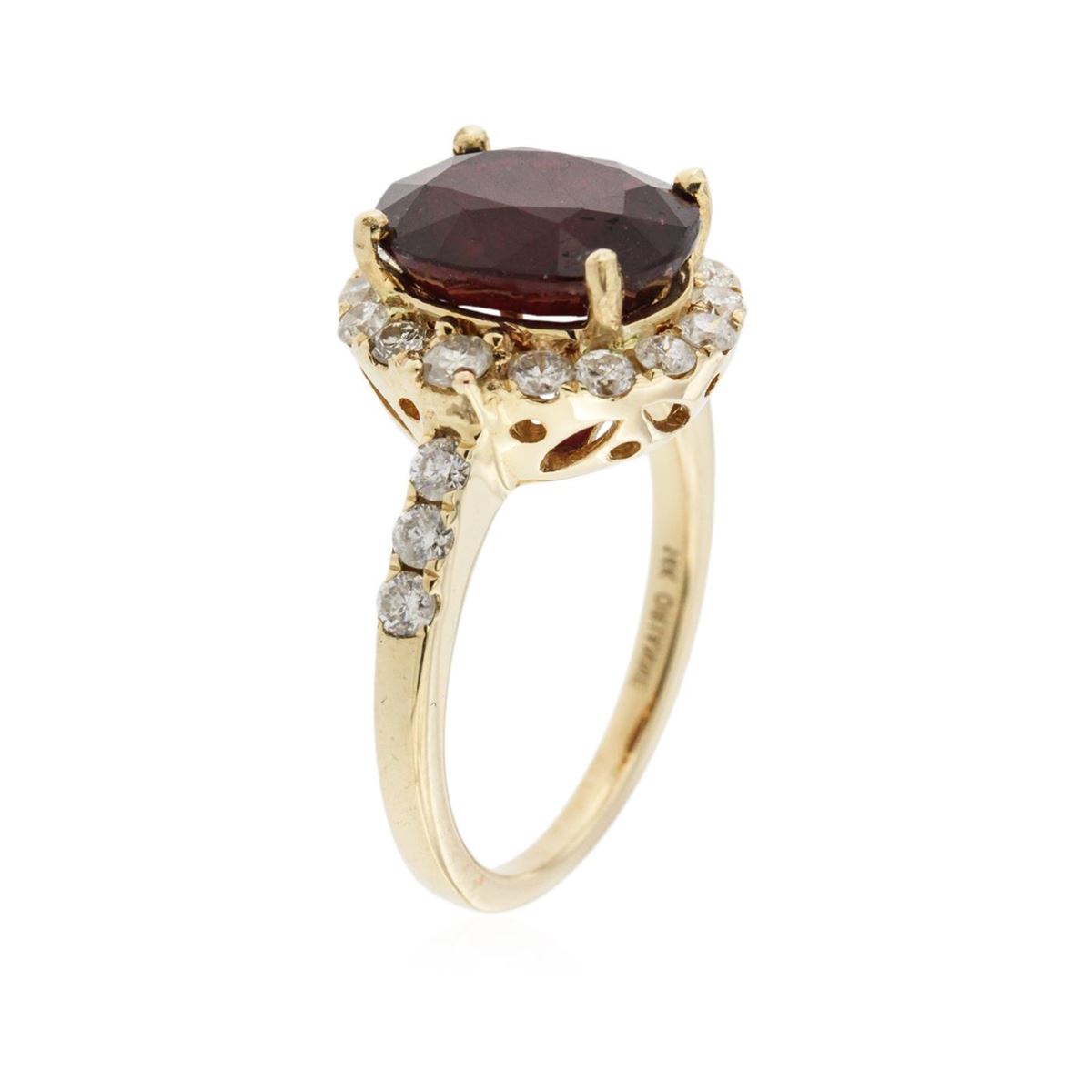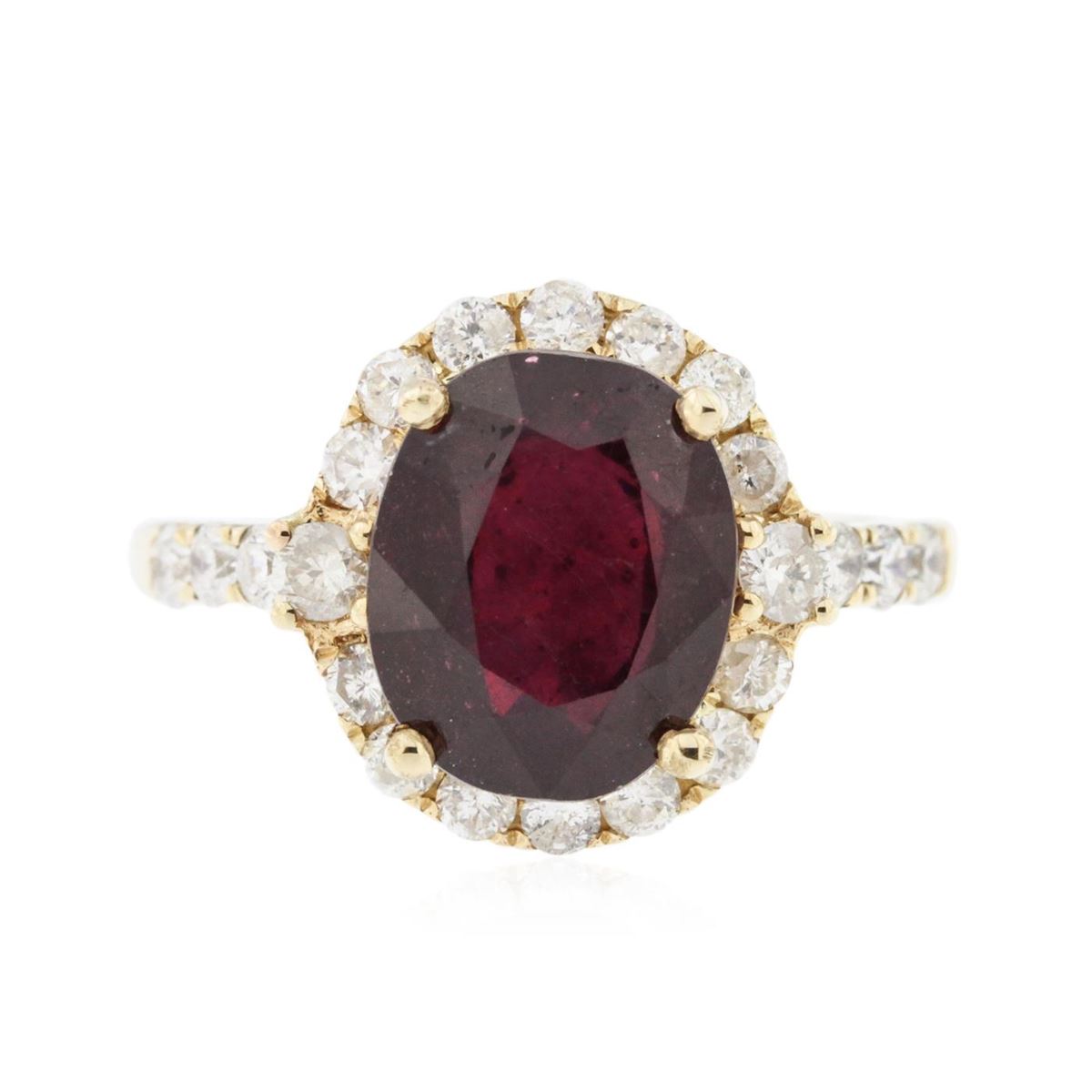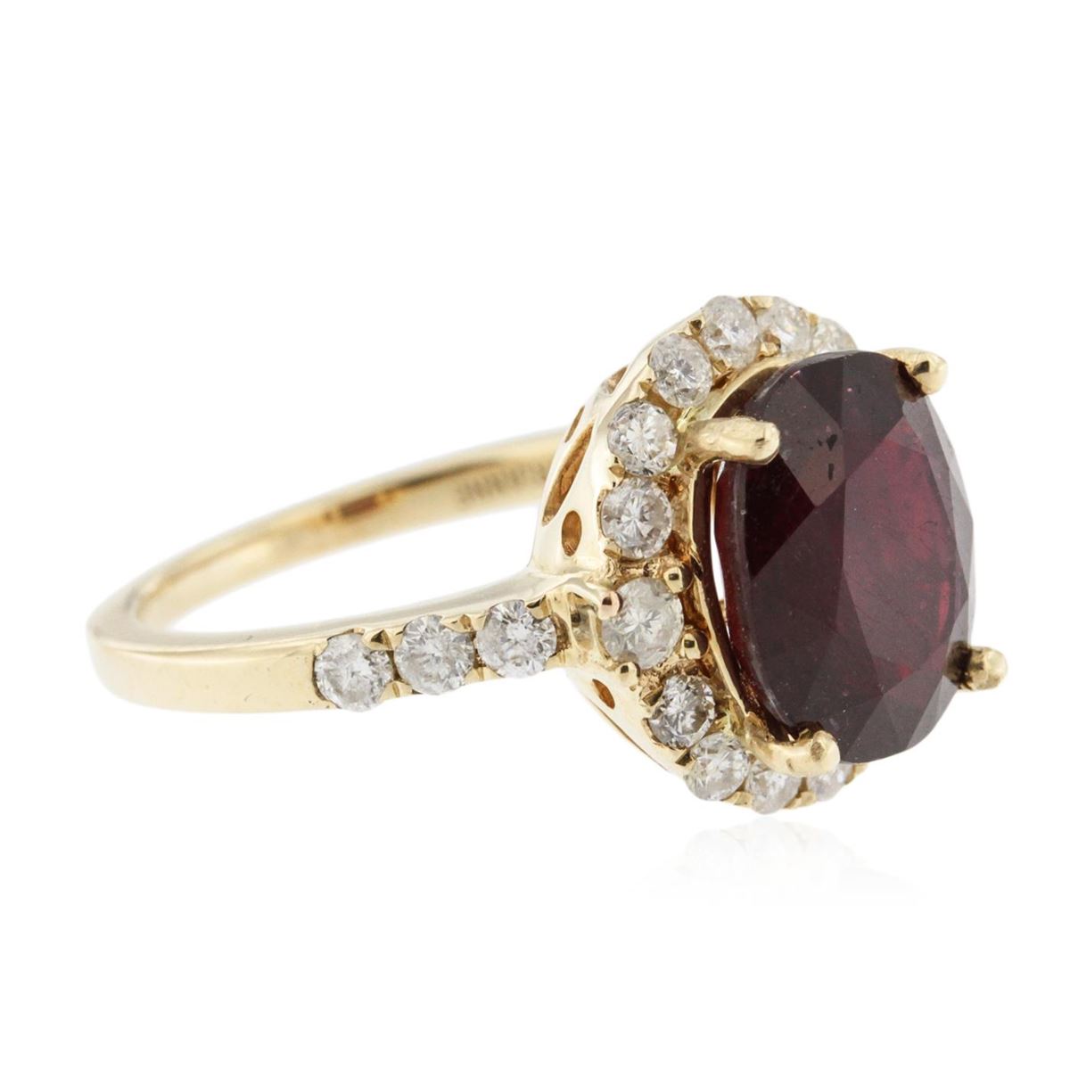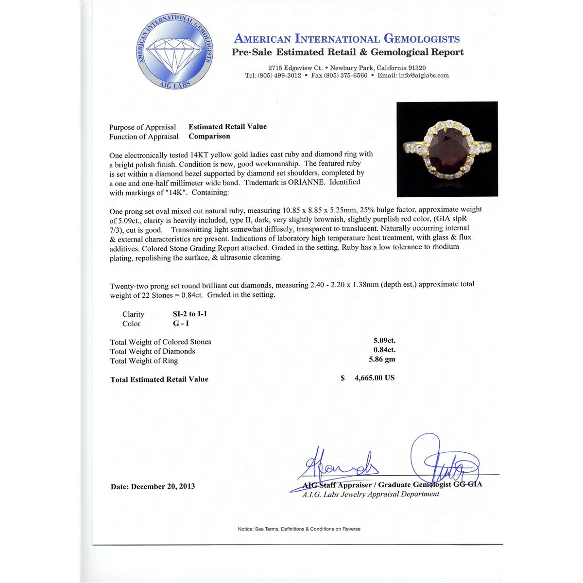 14KT yellow gold 5.09ct Ruby and Diamond Ring A6565. One electronically tested 14KT yellow gold ladies cast ruby and diamond ring with a bright polish finish. The featured ruby is set within a diamond bezel supported by diamond set shoulders, completed by a one and one-half millimeter wide band. Trademark is ORIANNE. Identified with markings of "14K". Condition is new, good workmanship. Containing: One prong set oval mixed cut natural ruby, measuring 10.85 x 8.85 x 5.25mm, 25%. bulge factor, approximate weight of 5.09ct., clarity is heavily included, type II, dark, very slightly brownish, slightly purplish red color, (GIA slpR 7/3), cut is good. Transmitting light somewhat diffusely, transparent to translucent. Naturally occurring internal & external characteristics are present. Indications of laboratory high temperature heat treatment, with glass & flux additives. Colored Stone Grading Report attached. Graded in the setting. Ruby has a low tolerance to rhodium plating, repolishing the surface, & ultrasonic cleaning.Twenty-Two prong set round brilliant cut diamonds, measuring 2.40 - 2.20 x 1.38mm (depth est.) approximate. Total Weight of 22 Stones = 0.84ct. Graded in the setting. Clarity: SI-2 to I-1. Color: G - I. Total Weight of Colored Stones 5.09ct. Total Weight of Diamonds 0.84ct. AIG Appraised at $4,665.00.