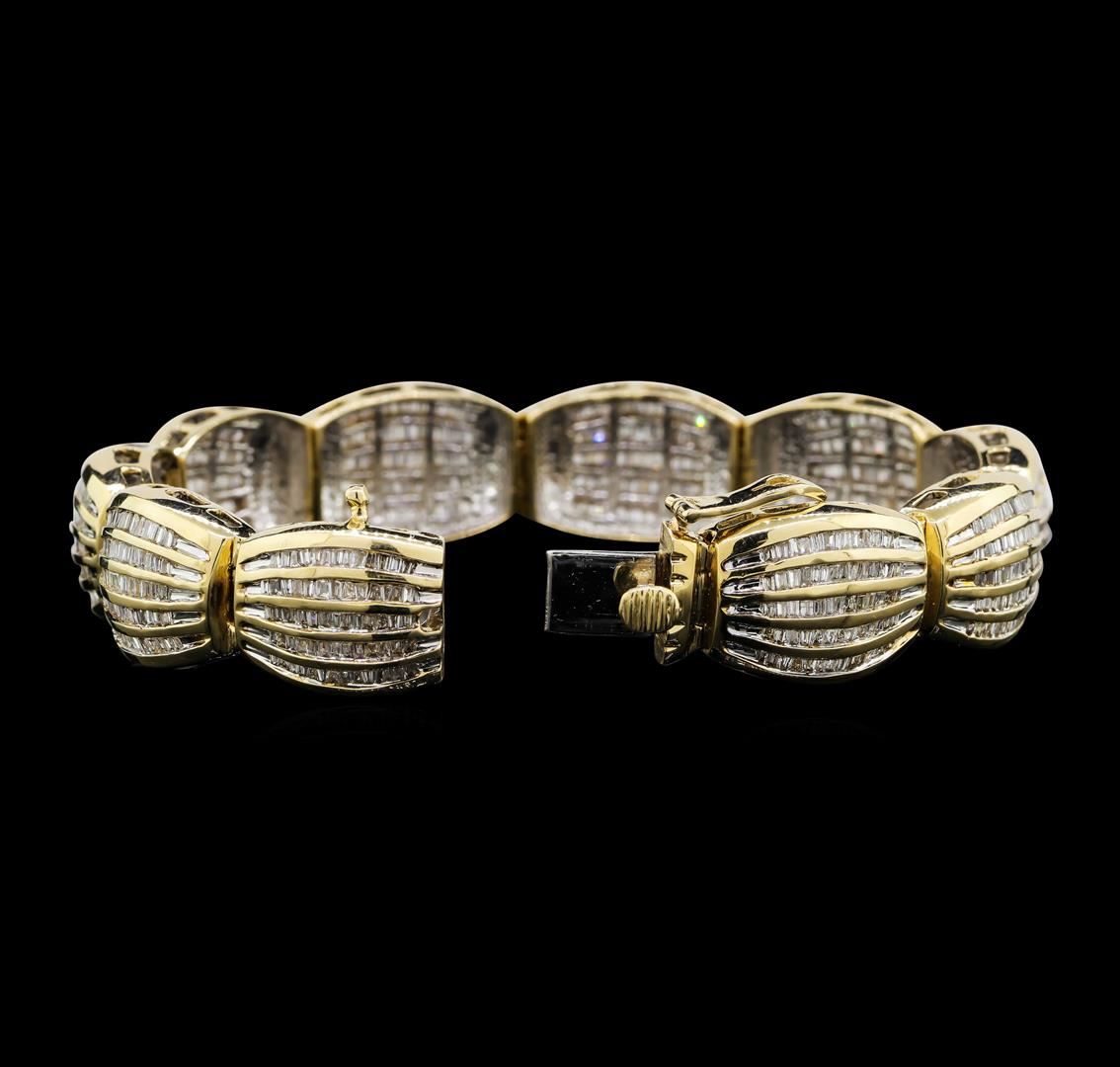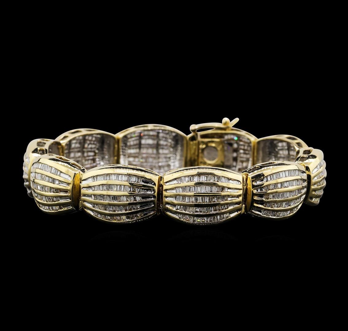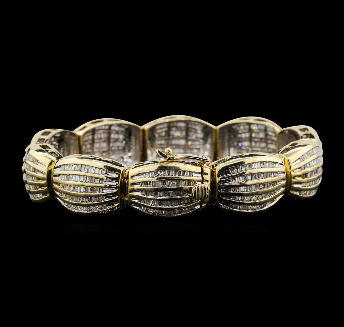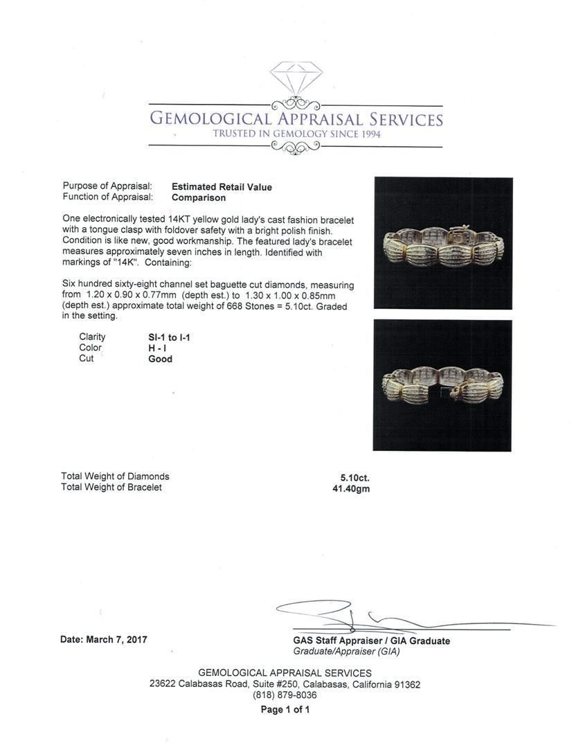 One electronically tested 14KT yellow gold lady's cast fashion bracelet with a tongue clasp with foldover safety with a bright polish finish. The featured lady's bracelet measures approximately seven inches in length. Identified with markings of "14K". Condition is like new, good workmanship. Containing: Six Hundred Sixty-Eight channel set baguette cut diamonds, measuring from 1.20 x 0.90 x 0.77mm (depth est.) to 1.30 x 1.00 x 0.85mm (depth est.) approximate total weight of 668 Stones = 5.10ct. Graded in the setting.Color H - IClarity SI-1 to I-1 Cut Good. Total Weight of Diamonds 5.10ct. Total Weight of Bracelet 41.40gm AIG Appraised at $11790.00. GAS Appraised.