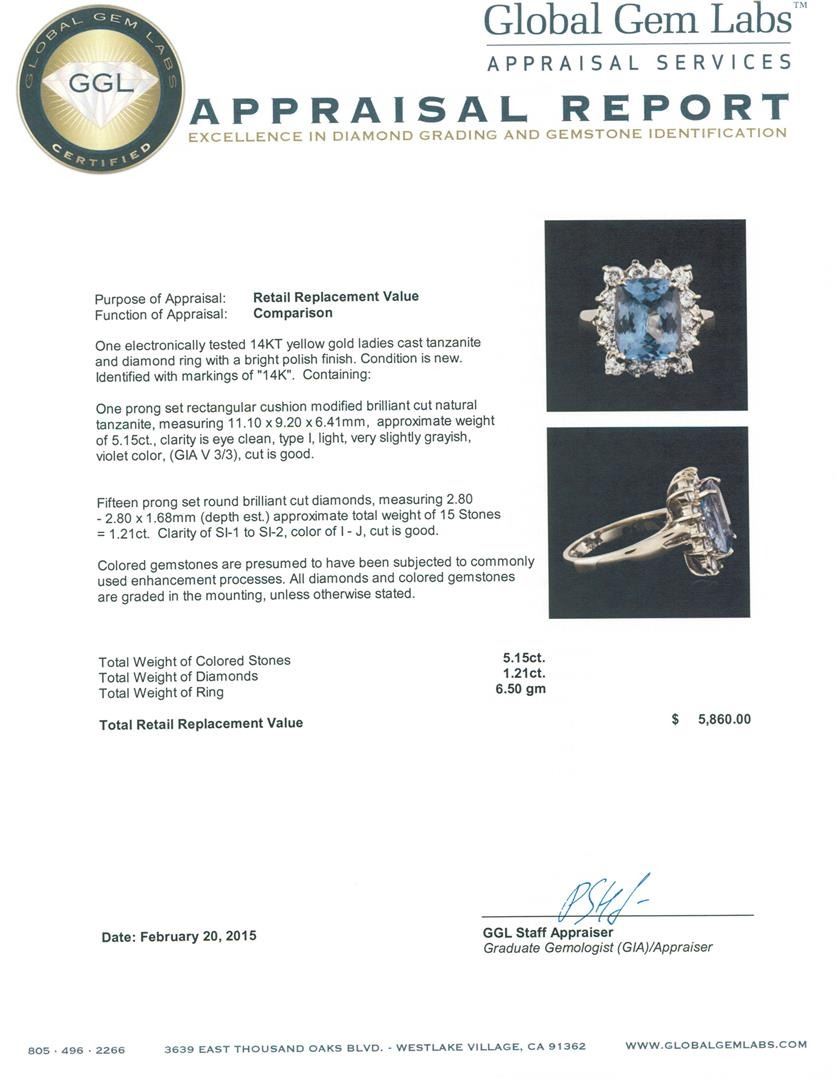 One electronically tested 14KT yellow gold ladies cast tanzanite and diamond ring with a bright polish finish. Identified with markings of "14K". Condition is new. Containing: One prong set rectangular cushion modified brilliant cut natural tanzanite, measuring 11.10 x 9.20 x 6.41mm, approximate weight of 5.15ct., clarity is eye clean, type I, light, very slightly grayish, violet color, (GIA V 3/3), cut is good. Fifteen prong set round brilliant cut diamonds, measuring 2.80 - 2.80 x 1.68mm (depth est.) approximate total weight of 15 Stones = 1.21ct. Clarity: SI-1 to SI-2. Color: I - J, Cut is Good. Colored gemstones are presumed to have been subjected to commonly used enhancement processes. All diamonds and colored gemstones are graded in the mounting, unless otherwise stated. Total Weight of Colored Stones 5.15ct. Total Weight of Diamonds 1.21ct. Total Weight of Ring 6.50 grams. GGL Appraised.