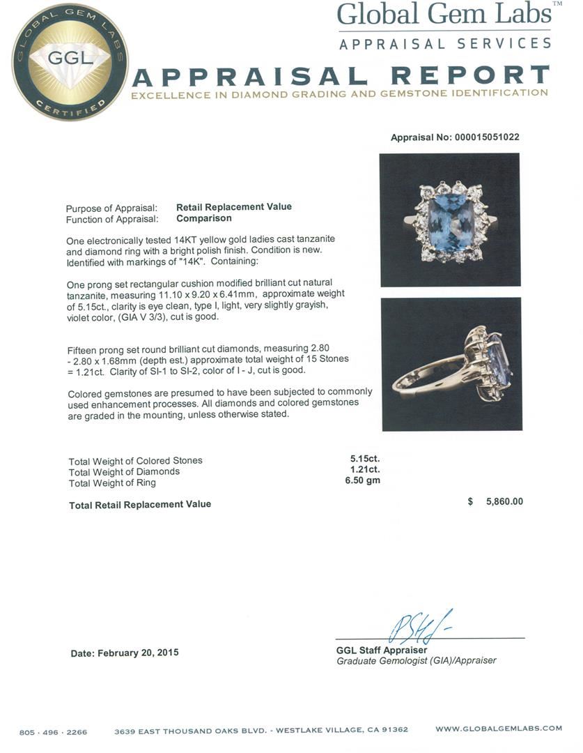 One electronically tested 14KT yellow gold ladies cast tanzanite and diamond ring with a bright polish finish. Identified with markings of "14K". Condition is new. Containing: One prong set rectangular cushion modified brilliant cut natural tanzanite, measuring 11.10 x 9.20 x 6.41mm, approximate weight of 5.15ct., clarity is eye clean, type I, light, very slightly grayish, violet color, (GIA V 3/3), cut is good. Fifteen prong set round brilliant cut diamonds, measuring 2.80 - 2.80 x 1.68mm (depth est.) approximate total weight of 15 Stones = 1.21ct. Clarity: SI-1 to SI-2. Color: I - J, Cut is Good. Colored gemstones are presumed to have been subjected to commonly used enhancement processes. All diamonds and colored gemstones are graded in the mounting, unless otherwise stated. Total Weight of Colored Stones 5.15ct. Total Weight of Diamonds 1.21ct. Total Weight of Ring 6.50 grams. GGL Appraised at $5,860.00.