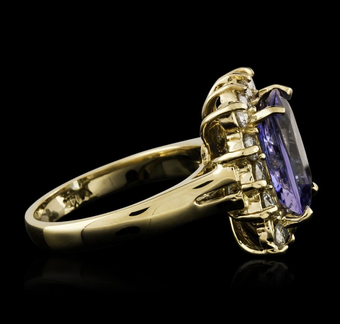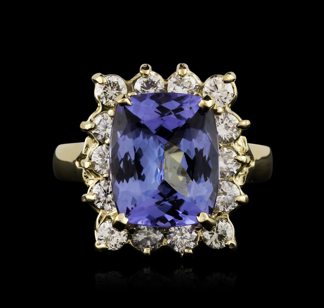 One electronically tested 14KT yellow gold ladies cast tanzanite and diamond ring with a bright polish finish. Identified with markings of "14K". Condition is new. Containing: One prong set rectangular cushion modified brilliant cut natural tanzanite, measuring 11.10 x 9.20 x 6.41mm, approximate weight of 5.15ct., clarity is eye clean, type I, light, very slightly grayish, violet color, (GIA V 3/3), cut is good. Fifteen prong set round brilliant cut diamonds, measuring 2.80 - 2.80 x 1.68mm (depth est.) approximate total weight of 15 Stones = 1.21ct. Clarity: SI-1 to SI-2. Color: I - J, Cut is Good. Colored gemstones are presumed to have been subjected to commonly used enhancement processes. All diamonds and colored gemstones are graded in the mounting, unless otherwise stated. Total Weight of Colored Stones 5.15ct. Total Weight of Diamonds 1.21ct. Total Weight of Ring 6.50 grams. GGL Appraised at $5,860.00.