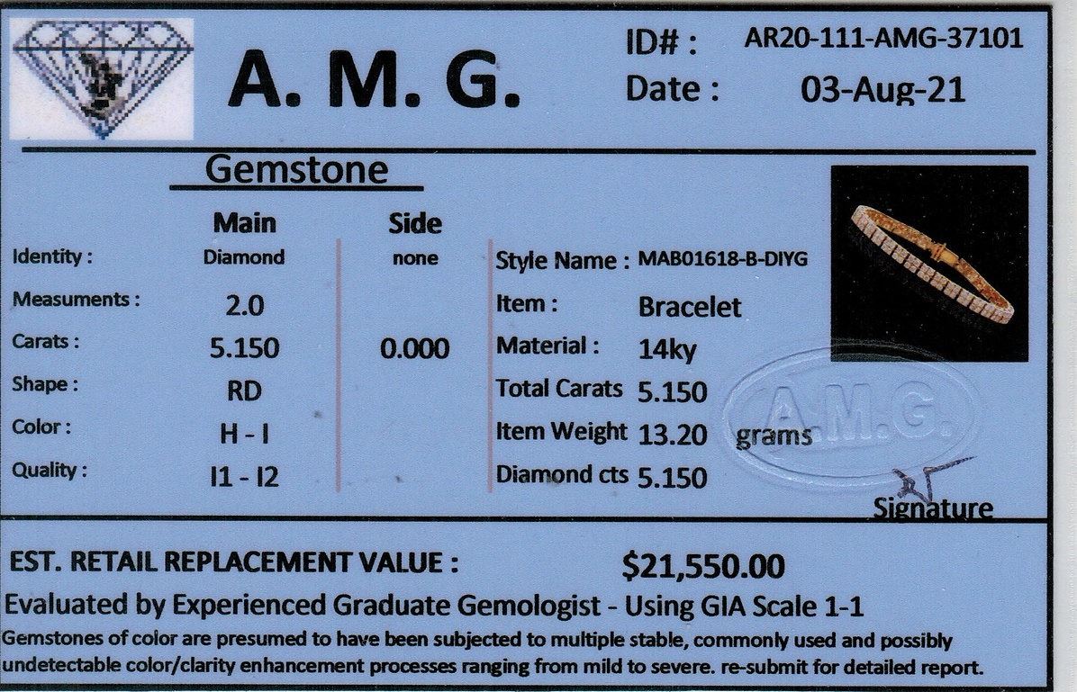 (148) round Diamonds with a total weight of 5.15cts with a color of H-I and clarity of I1-I2. Total weight of this bracelet is 13.20 grams. Length of this bracelet is 7.25 inches.