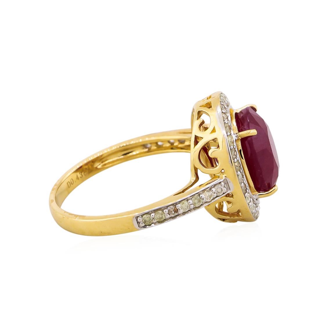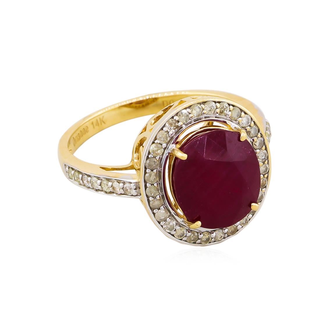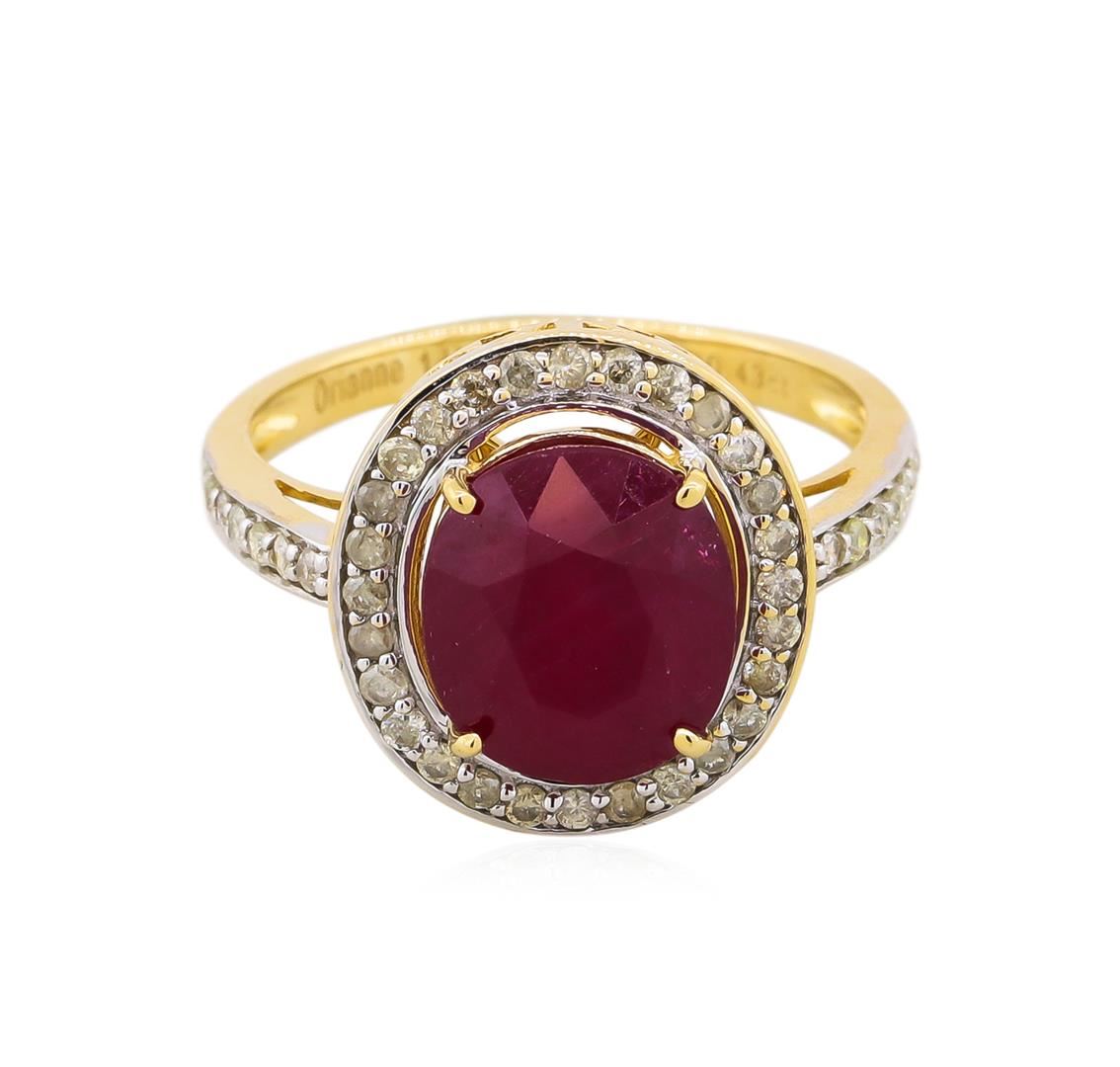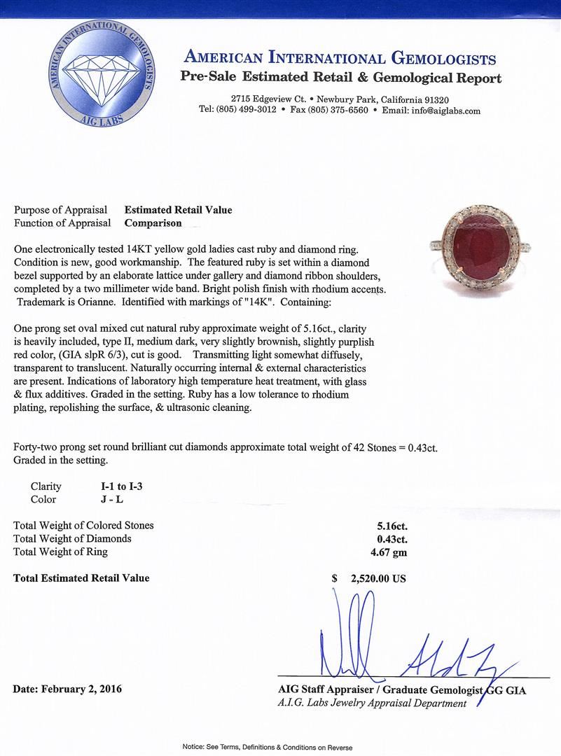 One electronically tested 14KT yellow gold ladies cast ruby and diamond ring. The featured ruby is set within a diamond bezel supported by an elaborate lattice under gallery and diamond ribbon shoulders, completed by a two millimeter wide band. Bright polish finish with rhodium accents. Trademark is Orianne. Identified with markings of "14K". Condition is new, good workmanship. Containing: One prong set oval mixed cut natural ruby approximate weight of 5.16ct., clarity is heavily included, type II, medium dark, very slightly brownish, slightly purplish red color, (GIA slpR 6/3), cut is good. Transmitting light somewhat diffusely, transparent to translucent. Naturally occurring internal & external characteristics are present. Indications of laboratory high temperature heat treatment, with glass & flux additives. Graded in the setting. Ruby has a low tolerance to rhodium plating, repolishing the surface, & ultrasonic cleaning.Forty-Two prong set round brilliant cut diamonds approximate. Total Weight of 42 Stones = 0.43ct. Graded in the setting. Clarity: I-1 to I-3. Color: J - L. Total Weight of Colored Stones 5.16ct. Total Weight of Diamonds 0.43ct. Total Weight of Ring 4.67gm. AIG Appraised at $2,520.00.