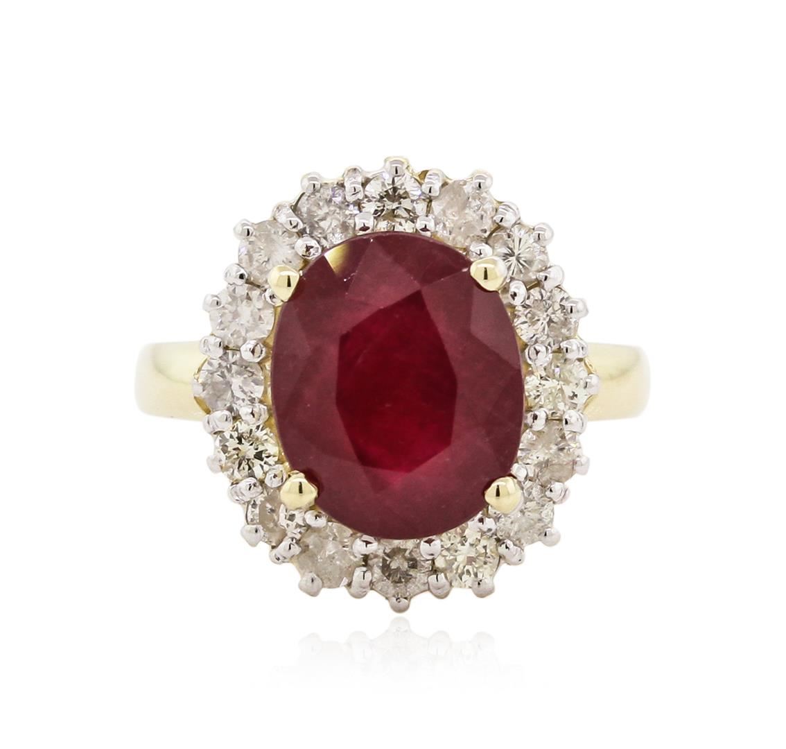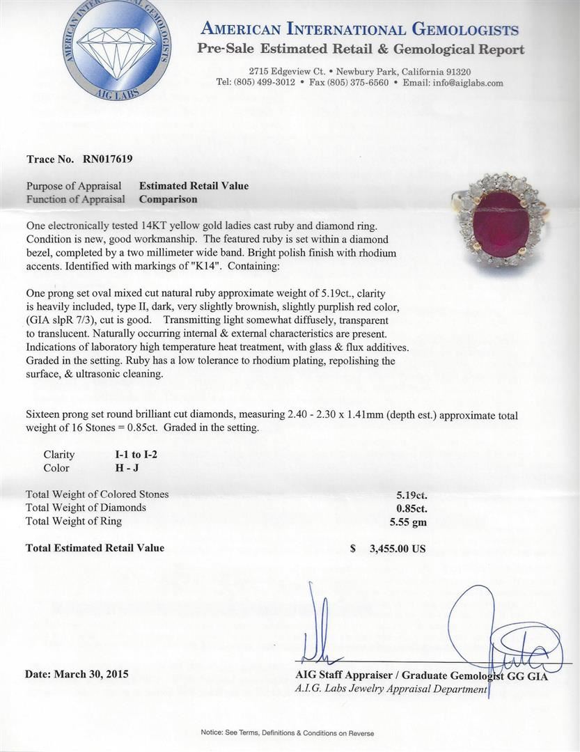 One electronically tested 14KT yellow gold ladies cast ruby and diamond ring. Condition is new, good workmanship. The featured ruby is set within a diamond bezel, completed by a two millimeter wide band. Bright polish finish with rhodium accents. Identified with markings of "K14". Containing: One prong set oval mixed cut natural ruby approximate weight of 5.19ct., clarity is heavily included, type II, dark, very slightly brownish, slightly purplish red color, (GIA slpR 7/3), cut is good. Transmitting light somewhat diffusely, transparent to translucent. Naturally occurring internal and external characteristics are present. Indications of laboratory high temperature heat treatment, with glass and flux additives. Graded in the setting. Ruby has a low tolerance to rhodium plating, repolishing the surface, and ultrasonic cleaning. Sixteen prong set round brilliant cut diamonds, measuring 2.40 -2.30 x 1.41 mm (depth est.) approximate total weight of 16 Stones = 0.85ct. Graded in the setting. Clarity: I-1 to I-2. Color: H-J. Total weight of Colored Stones = 5.19ct. Total weight of Diamonds = 0.85ct. Total weight of Ring = 5.55 grams. AIG Appraised at $3,455.00.