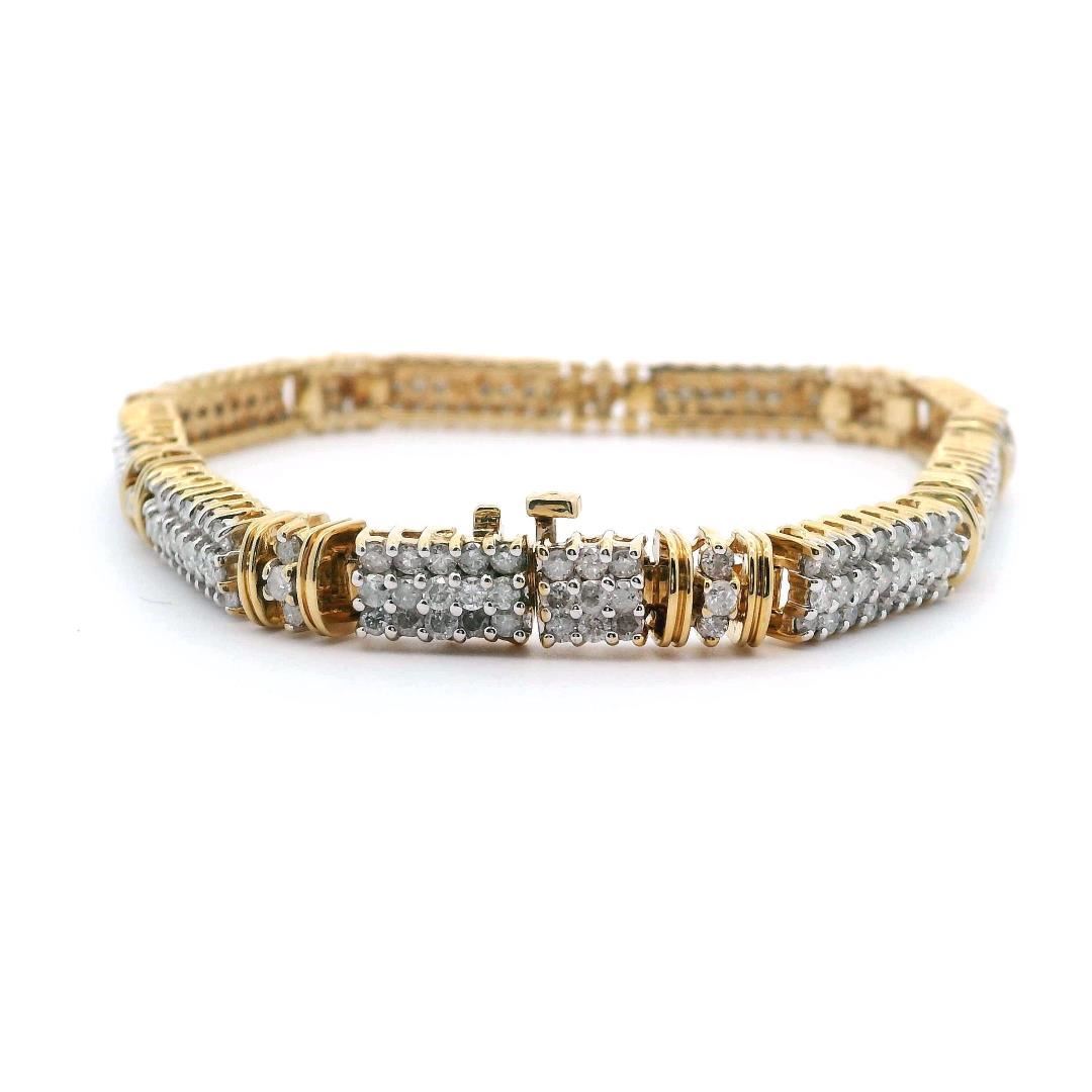 A sophisticated 14KT yellow gold diamond straight-line bracelet featuring 246 round brilliant cut diamonds with a total weight of 5.20 carats. The bracelet measures 7 1/4 inches and is secured with a tongue clasp and fold-under safety. With its station motif and polished finish, this elegant piece is a timeless addition to any jewelry collection. Estimated Retail Value: $14,000.