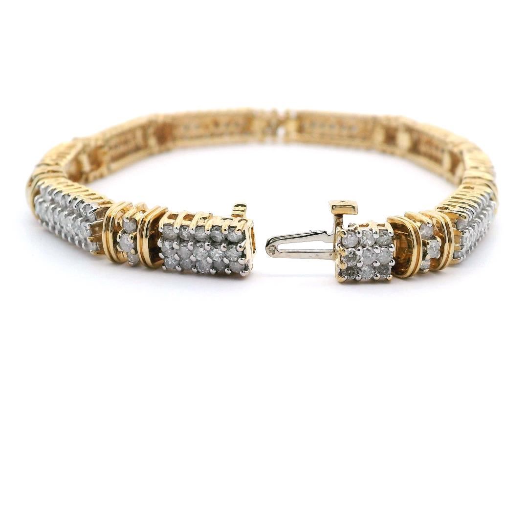 A sophisticated 14KT yellow gold diamond straight-line bracelet featuring 246 round brilliant cut diamonds with a total weight of 5.20 carats. The bracelet measures 7 1/4 inches and is secured with a tongue clasp and fold-under safety. With its station motif and polished finish, this elegant piece is a timeless addition to any jewelry collection. Estimated Retail Value: $14,000.