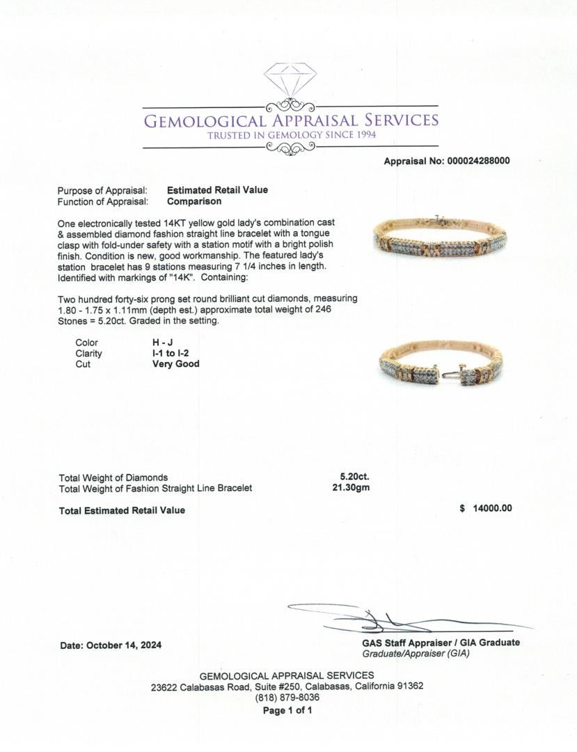 A sophisticated 14KT yellow gold diamond straight-line bracelet featuring 246 round brilliant cut diamonds with a total weight of 5.20 carats. The bracelet measures 7 1/4 inches and is secured with a tongue clasp and fold-under safety. With its station motif and polished finish, this elegant piece is a timeless addition to any jewelry collection. Estimated Retail Value: $14,000.
