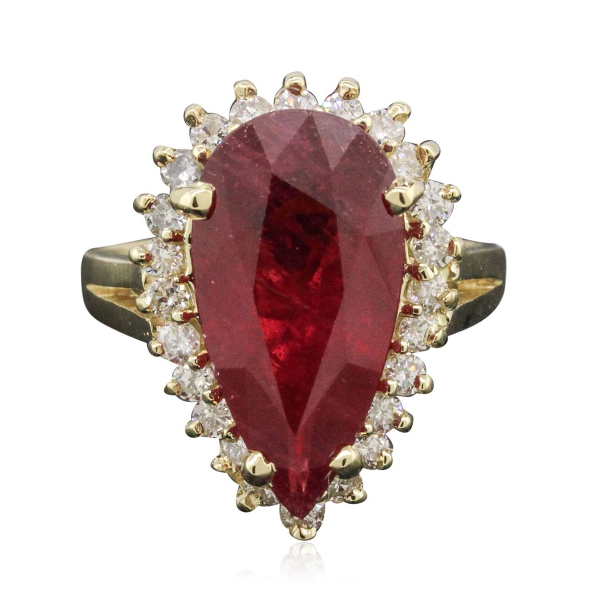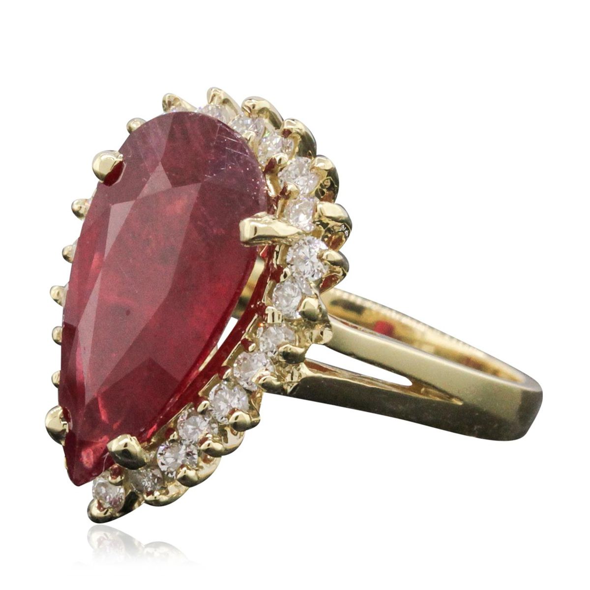 One electronically tested 14KT yellow gold ladies combination cast & assembled ring with a bright polish finish. Condition is new. Identified with markings of "14K". Containing: One prong set pear modified brilliant cut natural ruby, measuring 16.44 x 8.52 x 4.66mm, approximate weight of 5.22ct., clarity is heavily included, type II, medium, very slightly brownish, strongly purplish red color, (GIA stpR 5/3), cut is good. Twenty-Four prong set round brilliant cut diamonds, measuring 1.50 - 1.50 x 0.90mm (depth est.) approximate. Total Weight of 24 Stones = 0.30ct. Clarity: I-1 to I-2. Color: K - L, Cut is Good. Colored gemstones are presumed to have been subjected to commonly used enhancement processes. All diamonds and colored gemstones are graded in the mounting, unless otherwise stated. Total Weight of Colored Stones 5.22ct. Total Weight of Diamonds 0.30ct. Total Weight of Ring 5.80 grams. GGL Appraised at $4,395.00.