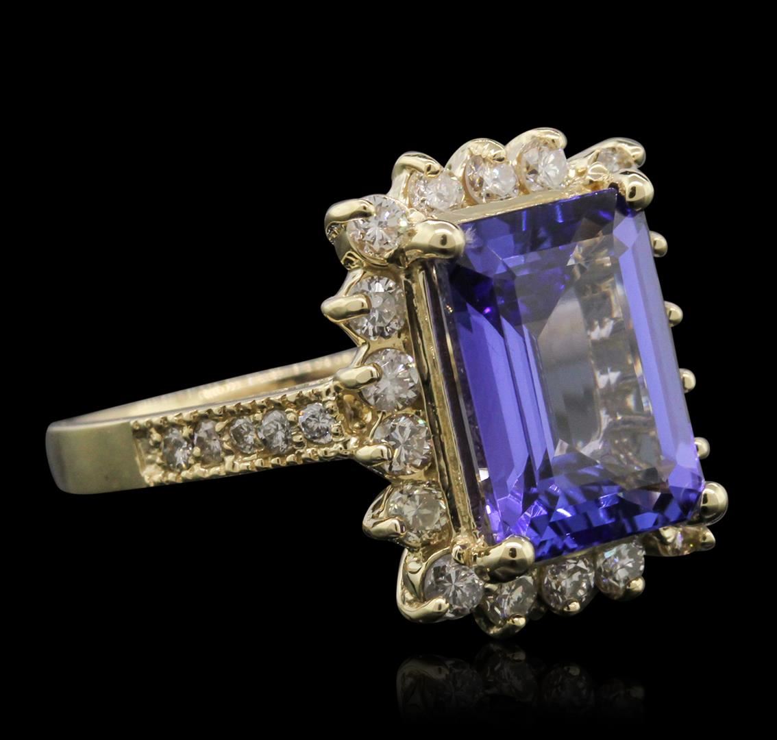 One electronically tested 14KT yellow gold Ladies combination cast & assembled ring with a bright polish finish. Identified with markings of "K14". Condition is new. Containing: One prong set emerald standard step cut natural tanzanite, measuring 12.08 x 9.73 x 5.00mm, approximate weight of 5.32ct., clarity is eye clean, type I, medium light, moderately strong, bluish violet color, (GIA bV 4/4), cut is very good. Colored gemstones are presumed to have been subjected to commonly used color/clarity enhancement processes. Eighteen prong set round brilliant cut diamonds, measuring 2.30 - 2.30 x 1.38mm (depth est.) approximate. Total Weight of 18 Stones = 0.80ct. Clarity: SI-2 to I-1. Color: K - L, Cut is Good. Ten prong set round brilliant cut diamonds, measuring 1.50 - 1.50 x 0.90mm (depth est.) approximate. Total Weight of 10 Stones = 0.12ct. Clarity: SI-2 to I-1. Color: K - L, Cut is Good. Total Weight of Colored Stones 5.32ct. Total Weight of Diamonds 0.92ct. Total Weight of Ring 6.90 grams. GGL Appraised at $9,115.00.