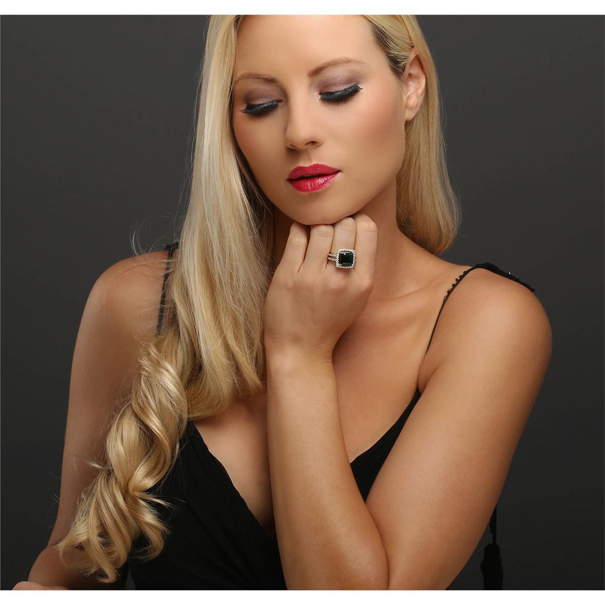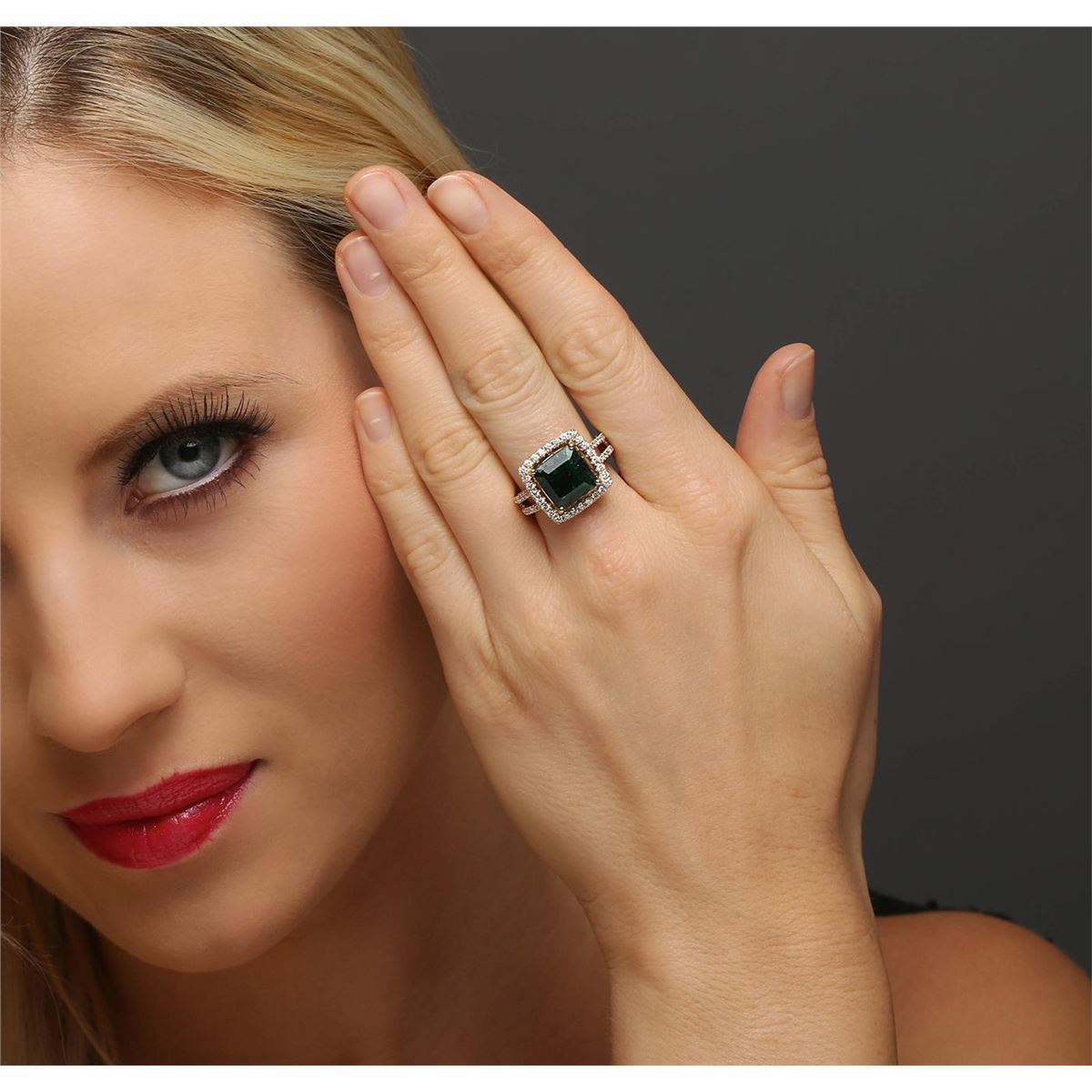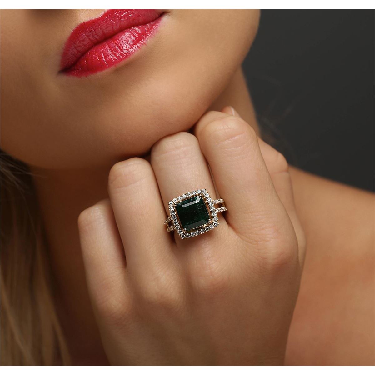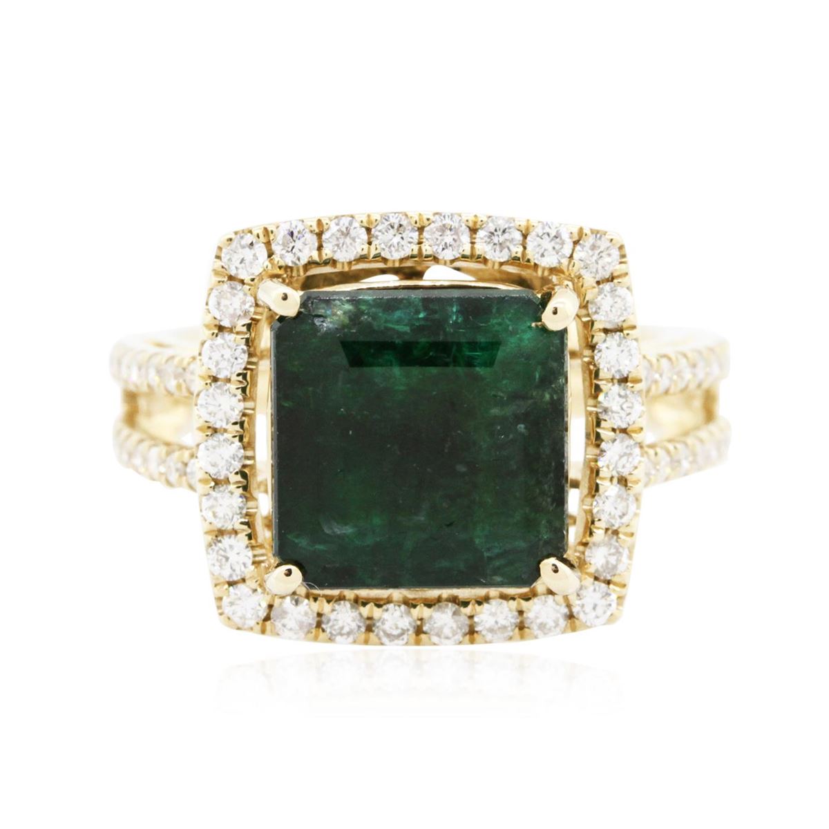 One electronically tested 14KT yellow gold ladies combination cast & assembled emerald and diamond ring with a split shank with a bright polish finish. Identified with markings of "14K". Condition is new. Containing: One prong set emerald standard step cut natural emerald, measuring 10.09 x 10.24 x 7.04mm, approximate weight of 5.34ct., clarity is heavily included, type III, dark, strong, green color, (GIA G 7/5), cut is good. Fifty-Six prong set round brilliant cut diamonds, measuring 1.40 - 1.20 x 0.78mm (depth est.) approximate total weight of 56 Stones = 0.45ct. Clarity: I-1 to I-2. Color: J - K, Cut is Good. Colored gemstones are presumed to have been subjected to commonly used enhancement processes. All diamonds and colored gemstones are graded in the mounting, unless otherwise stated total weight of Colored Stones 5.34ct. Total Weight of Diamonds 0.45ct. Total Weight of Ring 7.30 grams. GGL Appraised at $8,865.00.