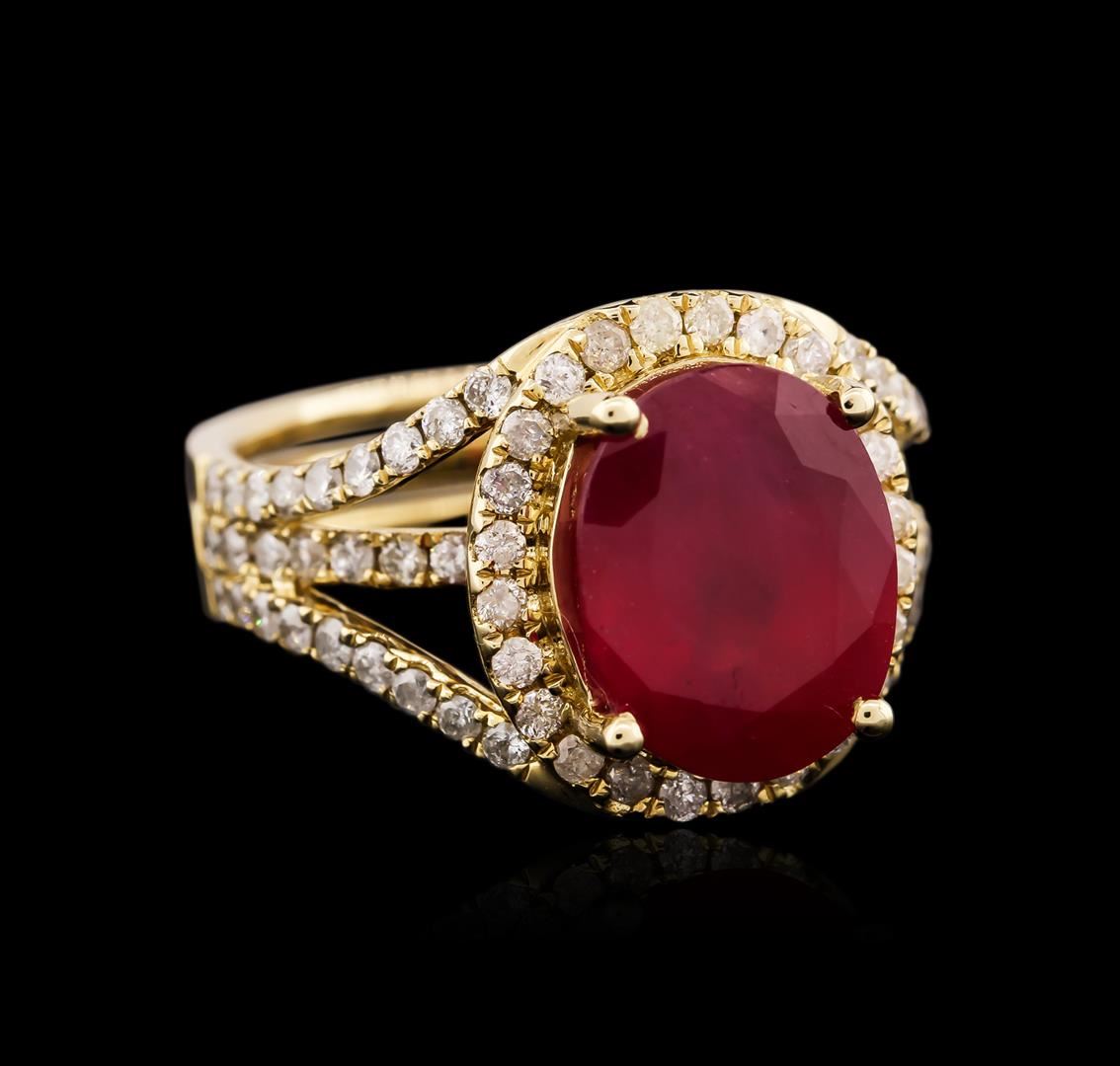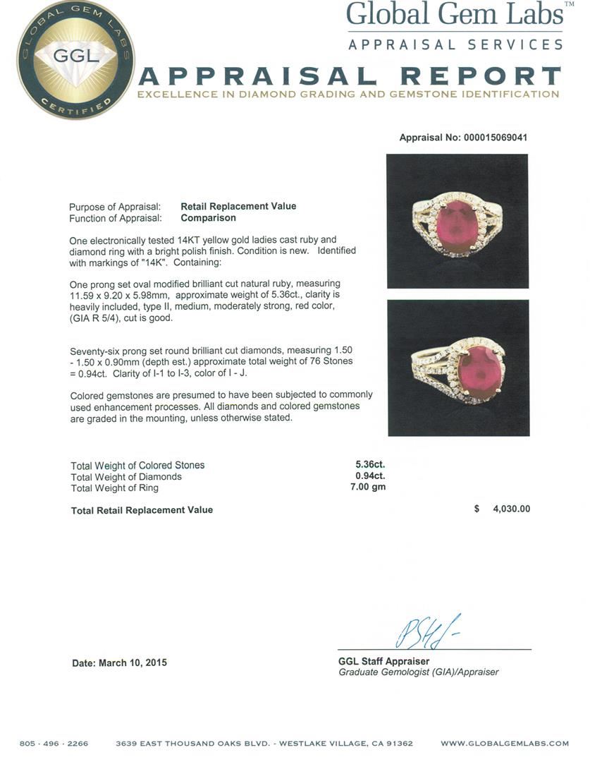 One electronically tested 14KT yellow gold ladies cast ruby and diamond ring with a bright polish finish. Identified with markings of "14K". Condition is new. Containing: One prong set oval modified brilliant cut natural ruby, measuring 11.59 x 9.20 x 5.98mm, approximate weight of 5.36ct., clarity is heavily included, type II, medium, moderately strong, red color, (GIA R 5/4), cut is good. Seventy-Six prong set round brilliant cut diamonds, measuring 1.50 - 1.50 x 0.90mm (depth est.) approximate total weight of 76 Stones = 0.94ct. Clarity: I-1 to I-3. Color: I - J. Colored gemstones are presumed to have been subjected to commonly used enhancement processes. All diamonds and colored gemstones are graded in the mounting, unless otherwise stated. Total Weight of Colored Stones 5.36ct. Total Weight of Diamonds 0.94ct. Total Weight of Ring 7.00 grams. GGL Appraised at $4,030.00.