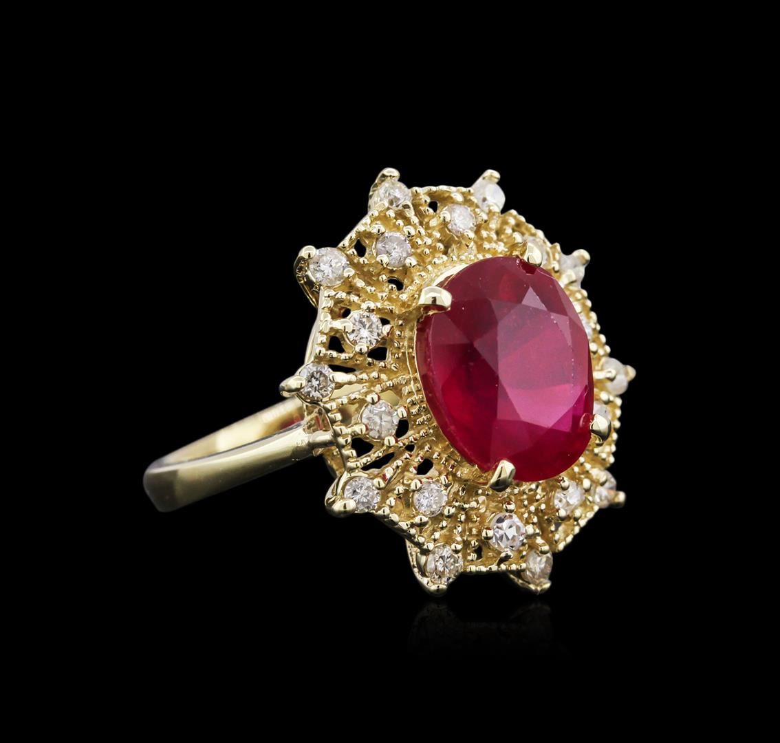 One electronically tested 14KT yellow gold ladies cast ruby and diamond ring with a flat shank with rounded edges with a bright polish finish. Identified with markings of "K14". Condition is new. Containing: One prong set oval modified brilliant cut natural ruby, measuring 11.15 x 9.23 x 5.75mm, exact weight 5.37ct., clarity is heavily included, type II, medium dark, very slightly brownish, strongly purplish red color, (GIA stpR 6/3), cut is good. Twenty prong set round brilliant cut diamonds, measuring 1.80 - 1.80 x 1.08mm (depth est.) approximate total weight of 20 Stones = 0.43ct. Clarity: SI-1 to I-2. Color: H - I, Cut is Good. All diamonds and colored gemstones are graded in the mounting, unless otherwise stated. Colored gemstones are presumed to have been subjected to commonly used enhancement processes. Total Weight of Colored Stones 5.37ct. Total Weight of Diamonds 0.43ct. Total Weight of Ring 6.80 grams. GGL Appraised at $2,715.00.