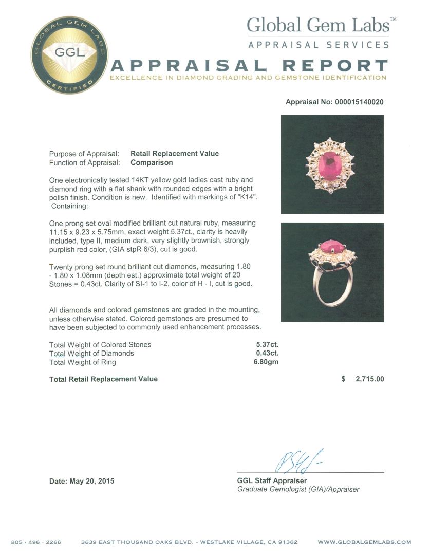 One electronically tested 14KT yellow gold ladies cast ruby and diamond ring with a flat shank with rounded edges with a bright polish finish. Identified with markings of "K14". Condition is new. Containing: One prong set oval modified brilliant cut natural ruby, measuring 11.15 x 9.23 x 5.75mm, exact weight 5.37ct., clarity is heavily included, type II, medium dark, very slightly brownish, strongly purplish red color, (GIA stpR 6/3), cut is good. Twenty prong set round brilliant cut diamonds, measuring 1.80 - 1.80 x 1.08mm (depth est.) approximate total weight of 20 Stones = 0.43ct. Clarity: SI-1 to I-2. Color: H - I, Cut is Good. All diamonds and colored gemstones are graded in the mounting, unless otherwise stated. Colored gemstones are presumed to have been subjected to commonly used enhancement processes. Total Weight of Colored Stones 5.37ct. Total Weight of Diamonds 0.43ct. Total Weight of Ring 6.80 grams. GGL Appraised at $2,715.00.