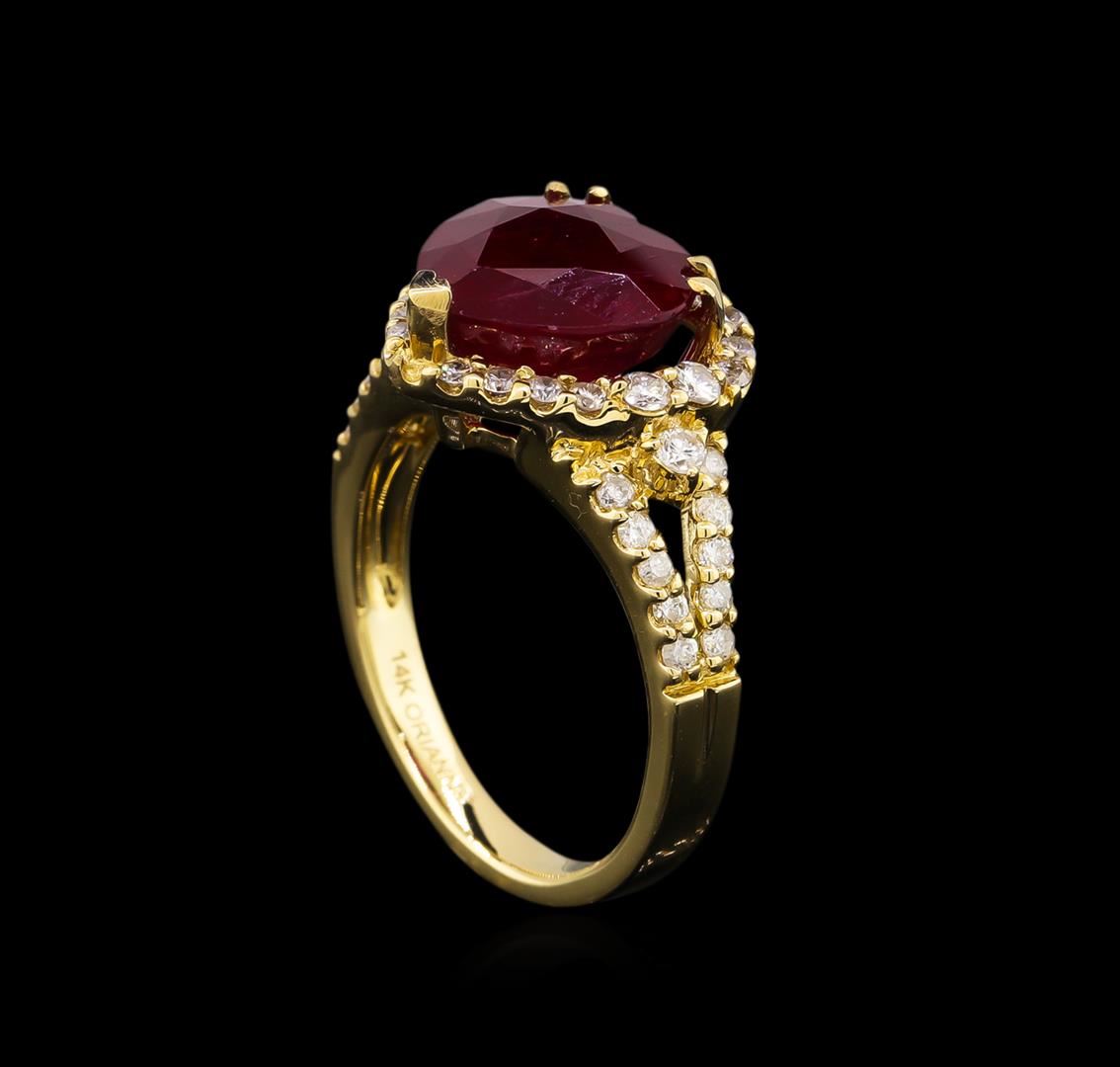 One electronically tested 14KT yellow gold Ladies cast ring with a bright polish finish. Condition is new. Identified with markings of "14K". Containing: One prong set heart modified brilliant cut natural ruby, measuring 11.00 x 10.50 x 6.00mm, approximate weight of 5.41ct., clarity is heavily included, type II, medium dark, moderately strong, strongly purplish red color, (GIA stpR 6/4), cut is good. Colored gemstones are presumed to have been subjected to commonly used color/clarity enhancement processes. Forty-Three prong set round brilliant cut diamonds, measuring 2.00 - 1.50 x 1.05mm (depth est.) approximate. Total Weight of 43 Stones = 0.84ct. Clarity: I-1 to I-3. Color: I - J, Cut is Good. Fourteen prong set round brilliant cut diamonds, measuring 1.10 - 1.10 x 0.66mm (depth est.) approximate. Total Weight of 14 Stones = 0.07ct. Clarity: I-1 to I-2. Color: I - J, Cut is Very Good. Total Weight of Colored Stones 5.41ct. Total Weight of Diamonds 0.91ct. Total Weight of Ring 5.80 Grams. GGL Appraised at $5,580.00.